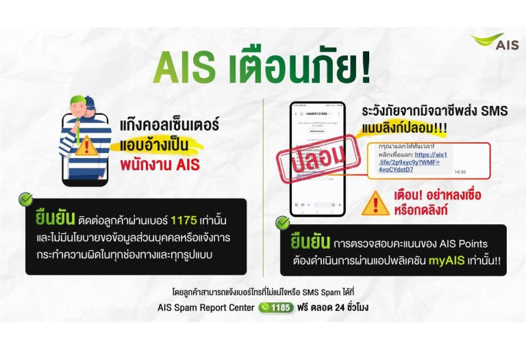 แก๊งคอลเซ็นเตอร์แอบอ้างเป็นพนักงาน AIS สร้างเรื่องหลอกลวงผู้ใช้งาน โดยใช้เบอร์มือถือ 0XX-XXXXXXX โทรหาลูกค้าแจ้งว่า มีข้อมูลส่วนบุคคลของลูกค้า อาทิ ชื่อ ที่อยู่ บัตรประชาชน ไปเปิดเบอร์และดำเนินการผิดกฎหมาย โดยมิจฉาชีพบางรายบอกชื่อ ที่อยู่ เลขบัตรประชาชนของลูกค้าได้อย่างถูกต้อง จนอาจทำให้ลูกค้าหลงเชื่อ จากนั้นมิจฉาชีพจะหลอกว่า ต้องโอนสายไปยังเจ้าหน้าที่ตำรวจ เพื่อให้ดำเนินการเกี่ยวกับข้อมูลของลูกค้า เป็นต้น ซึ่งถือเป็นจุดที่จะทำให้เกิดความเสี่ยงต่อลูกค้าทั้งในแง่การเปิดเผยข้อมูลส่วนบุคคล และ สูญเสียทรัพย์สิน AIS จึงขอย้ำเตือนลูกค้าอย่าหลงเชื่อการแอบอ้างในลักษณะนี้ พร้อมยืนยันว่า บริษัทฯ จะติดต่อลูกค้าผ่านเบอร์ 1175 เท่านั้น และไม่มีนโยบายขอข้อมูลส่วนบุคคลหรือแจ้งการกระทำความผิดในทุกช่องทางและทุกรูปแบบ