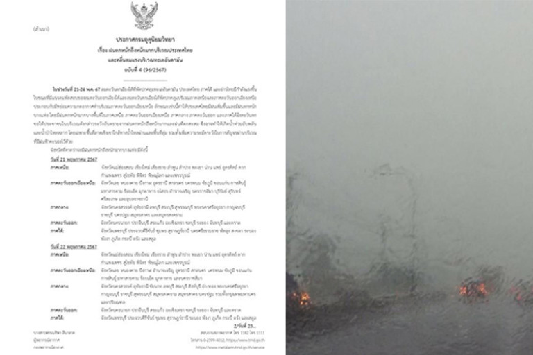 วันที่ 21 พ.ค.2567 กรมอุตุนิยมวิทยา ประกาศ เรื่อง ฝนตกหนักถึงหนักมากบริเวณประเทศไทย และคลื่นลมแรงบริเวณทะเลอันดามัน ฉบับที่ 4 (96/2567) ระบุว่า ในช่วงวันที่ 21-24 พ.ค. 67 ลมตะวันตกเฉียงใต้ที่พัดปกคลุมทะเลอันดามัน ประเทศไทย ภาคใต้ และอ่าวไทยมีกำลังแรงขึ้น