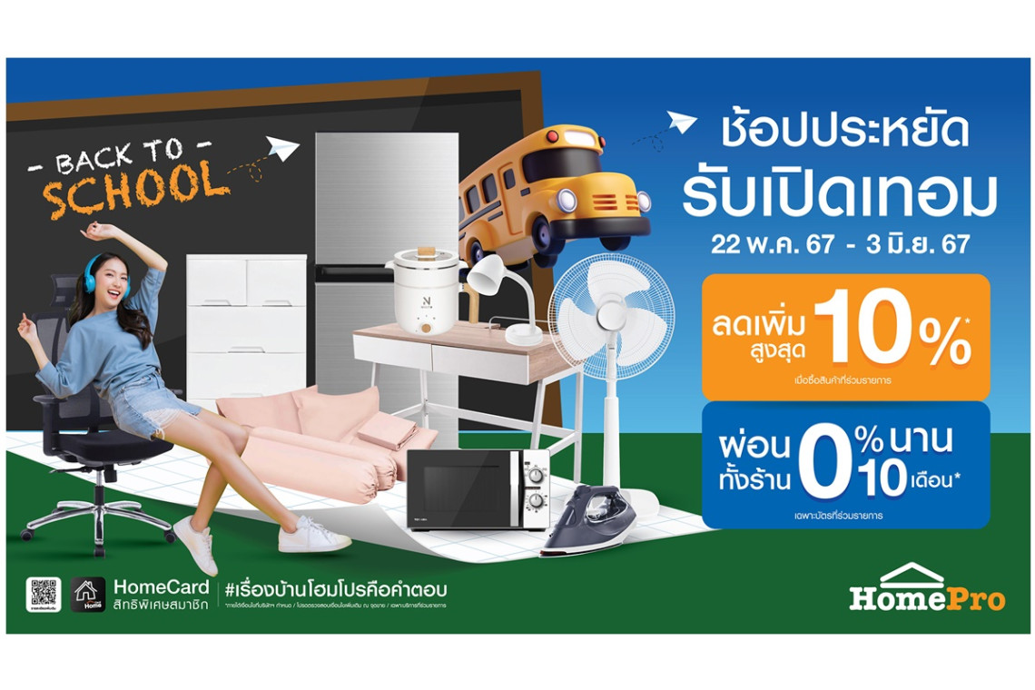 โฮมโปร (HMPRO) เดินหน้าจัดแคมเปญเพื่อโดนใจคุณลูกๆ และยังถูกใจคุณแม่อีกด้วยกับ “Back To School ช้อปประหยัด รับเปิดเทอม” เพื่อแบ่งเบาภาระค่าใช้จ่ายผู้ปกครองช่วงเปิดเทอมที่จะถึงนี้ ตอบรับมาตรการภาครัฐ ยกขบวนสินค้าของตกแต่งบ้านคุณภาพ เติมเต็มบรรยากาศการพักอาศัยต้อนรับเปิดเทอม จัดเต็มส่วนลดสูงสุด 10% พร้อมให้สิทธิพิเศษช้อปง่ายสะดวกกว่า ผ่อนทั้งร้าน 0% นานสูงสุด 10 เดือน ตั้งแต่ 22 พฤษภาคม 2567 – 3 มิถุนายน 2567 นี้ ที่ โฮมโปรทุกสาขาทั่วประเทศ และช้อปบนออนไลน์
