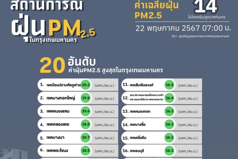 ศูนย์ข้อมูลคุณภาพอากาศกรุงเทพมหานครรายงานผลการตรวจวัด PM2.5 วันที่ 22 พ.ค. 2567 เวลา 05.00-07.00 น. (3 ชั่วโมงล่าสุด) ตรวจวัดได้ 8.1-20.4 มคก./ลบ.ม. ค่าเฉลี่ยของกรุงเทพมหานคร 13.8 มคก./ลบ.ม. ค่า PM2.5 มีแนวโน้มลดลง และอยู่ในเกณฑ์มาตรฐานทุกสถานีที่มีการตรวจวัด