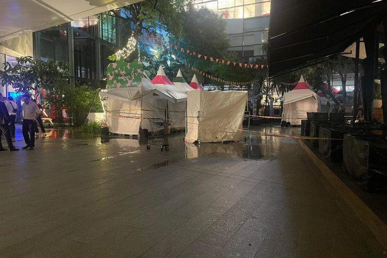 จากนั้นทางฝ่ายอาคารของศูนย์การค้าดังกล่าวได้นำเต็นท์สีขาวมาคุมศพไว้ และบริเวณศูนย์การค้าดังกล่าวมีฝนตกลงมาอย่างหนักและมีเจ้าหน้าที่รักษาความปลอดภัยของ ศูนย์การค้าดังกล่าว ยืนกันพื้นที่ไม่ให้ผู้เกี่ยวข้องเข้าไปและมีรายงานว่าผู้เสียชีวิตได้โดดลงมาจากชั้นที่ 5 ของศูนย์การค้าดังกล่าว