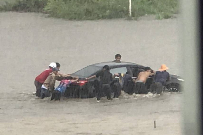 เวลา14.00 น.วันที่ 23 พ.ค.2567 ที่ถนนหน้าขนส่งใหม่ อำเภอเมือง ระยอง เกิดน้ำท่วมถนนช่วงที่เป็นแอ่งกะทะ มีรถยนต์เก๋ง ทะเบียน 1กศxxxกทม สีดำ จมน้ำและไหลตามกระแสน้ำ พลเมืองดี รีบวิ่งฝ่ากระแสน้ำไปช่วยเหลือ