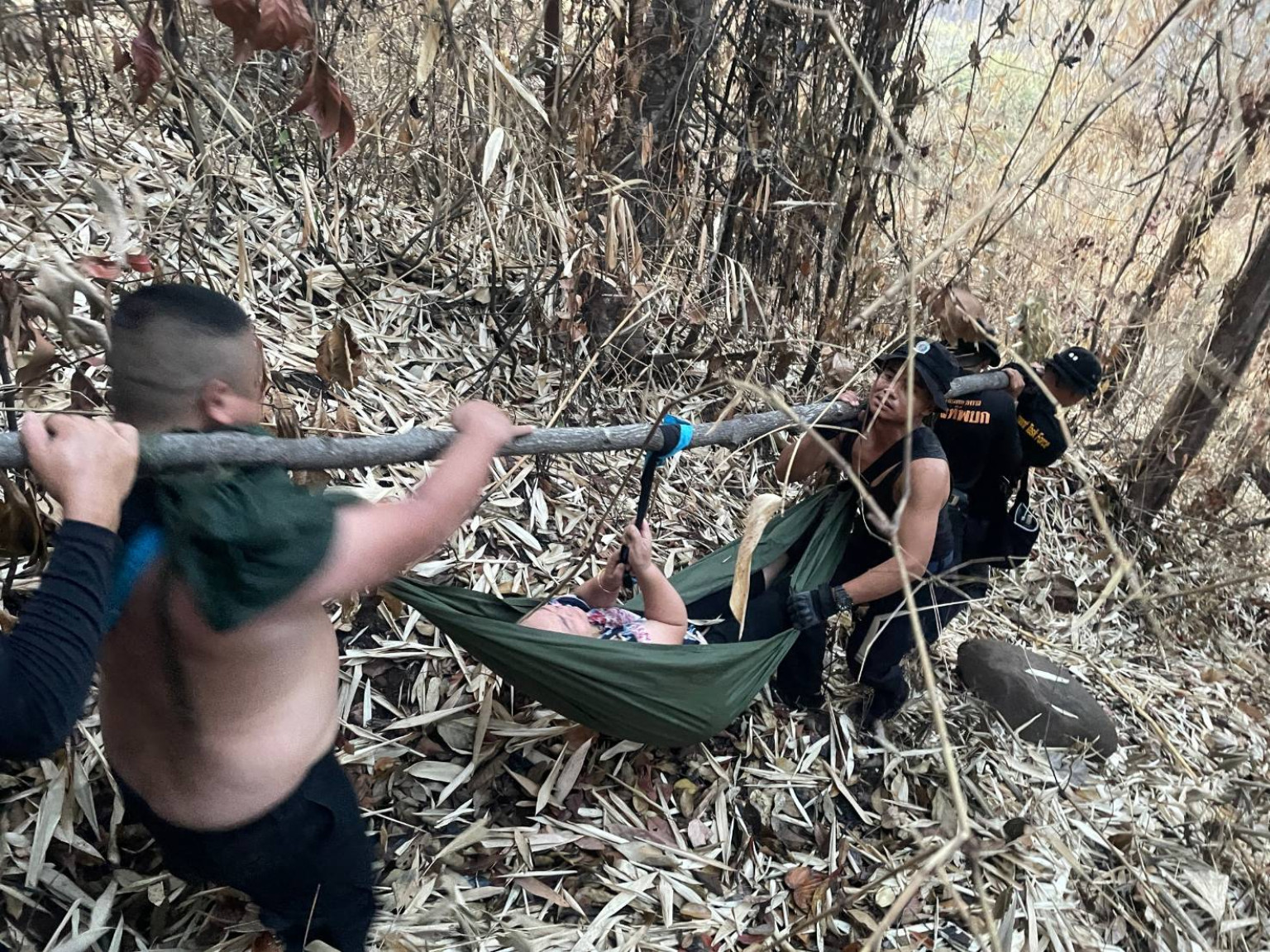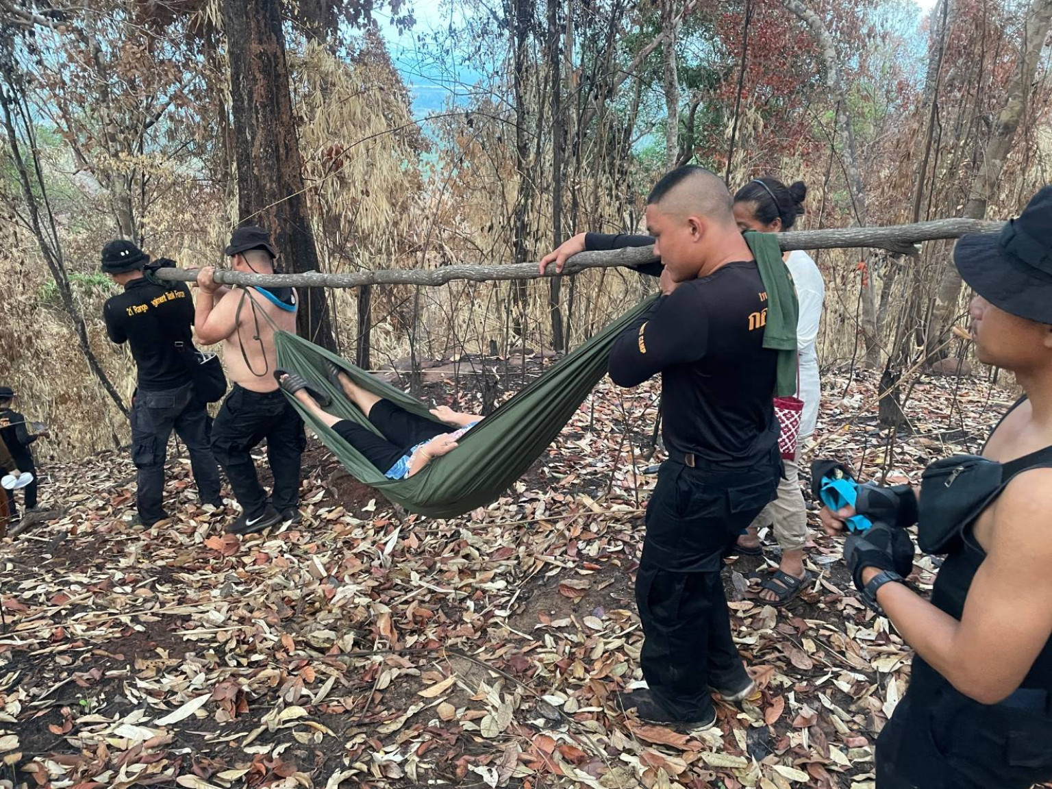 โดยการช่วยเหลือต้องแบกเปลสนามคานหาบ ลงจากเขาแบบทุลักทุเล ระยะทางไกลกว่า 3 กิโลเมตร ใช้เวลาเดินทางกว่า 4 ชั่วโมง ต้องใช้ความอดทนและความพยายามสูง บวกกับการปฐมพยาบาลช่วยชีวิตมาตลอดเส้นทาง จนกระทั่งถึงตีนเขา พร้อมได้ประสานรถกู้ชีพโรงพยาบาลอำเภอบ้านแพง ช่วยเหลือนำส่งไปรักษาที่โรงพยาบาล จนอาการปลอดภัย