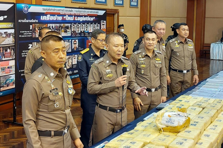 วันที่ 24 พ.ค.67 ที่ บข.ปส. พล.ต.ท.สำราญ นวลมา ผู้ช่วย ผบ.ตร./รอง ผอ.ศอ.ปส.ตร. พร้อมด้วย พล.ต.ท.คีรีศักดิ์ ตันตินวะชัย ผบช.ปส., พล.ต.ต.สมเกียรติ วัฒนพรมงคล, พล.ต.ต.สมบูรณ์ เทียนขาว, พล.ต.ต.ออมสิน ตรารุ่งเรือง ,พล.ต.ต.พลัฎฐ์ วิเศษสิงห์ รอง ผบช.ปส., พล.ต.ต.พรพิทักษ์ รู้ยืนยง รอง ผบช.ฯ ช่วยราชการ บช.ปส., พล.ต.ต.นพสิทธิ์ มิตรภักดี ผบก.ปส.1, พล.ต.ต.ธนรัชน์ สอนกล้า ผบก.ปส.2, พล.ต.ต.อดิศ เจริญสวัสดิ์ ผบก.ปส.3, พล.ต.ต.พรศักดิ์ สุรสิทธิ์ ผบก.ปส.4, พล.ต.ต.อิทธิพล จันทร์ศรีบุตร ผบก.ขส. และ พล.ต.ต.วิทัศน์ บริรักษ์ ผบก.สกส. ร่วมแถลงผลเปิดปฏิบัติการปิดล้อมตรวจค้น เครือข่าย “ใหม่ Logistics” ยึดทรัพย์กว่า 2,034 ล้านบาท