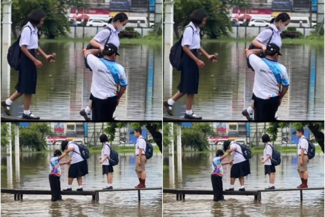 วันที่ 24 พ.ค.67 ผู้สื่อข่าวรายงานว่า มีผู้ใช้ติ๊กต็อก @phitphitchy โพสต์คลิป วันที่ฝนตกหนักน้ำท่วมโรงเรียนดังย่านสัตหีบ นักเรียนเดินทางกลับบ้านไม่ได้ ผู้อำนวยการโรงเรียน นำเก้าอี้ตัวยาวมาต่อเป็นสะพานทางเชื่อมไม่ต้องให้นักเรียนเดินลุยน้ำ ผู้อำนวยการเองมายืนในน้ำค่อยจูงนักเรียนข้ามสะพาน เป็นภาพที่น่าชื่นชมเป็นอย่างมาก