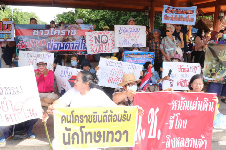 ที่ศาลาทรงไทยข้างลานย่าโม นายสุพจน์ พิริยะเกียรติ แกนนำกลุ่มพันธมิตรโคราช พร้อมพวกได้ชูป้ายไวนิลและป้ายเขียน ระบุข้อความ “คนโคราชยินดีต้อนรับนักโทษเทวา” “นช.-หนักแผ่นดิน -ขี้โกง-ลิงหลอกเจ้า” “แจกเงินมาวาระซ่อนเร้น” “อยากใหญ่ แต่ไม่เคารพกฎหมายใช้ได้ไหมครับ” ฯ โดยนายสมโภชน์ ประสาทไทย ผู้ประสานงานกลุ่มคนเสื้อแดงโคราช ได้เดินมาจับมือพูดคุยกับนายสุพจน์ เพื่อเห็นแก่เมืองโคราช แสดงออกทางประชาธิปไตยได้แต่ไม่ใช้ความรุนแรง