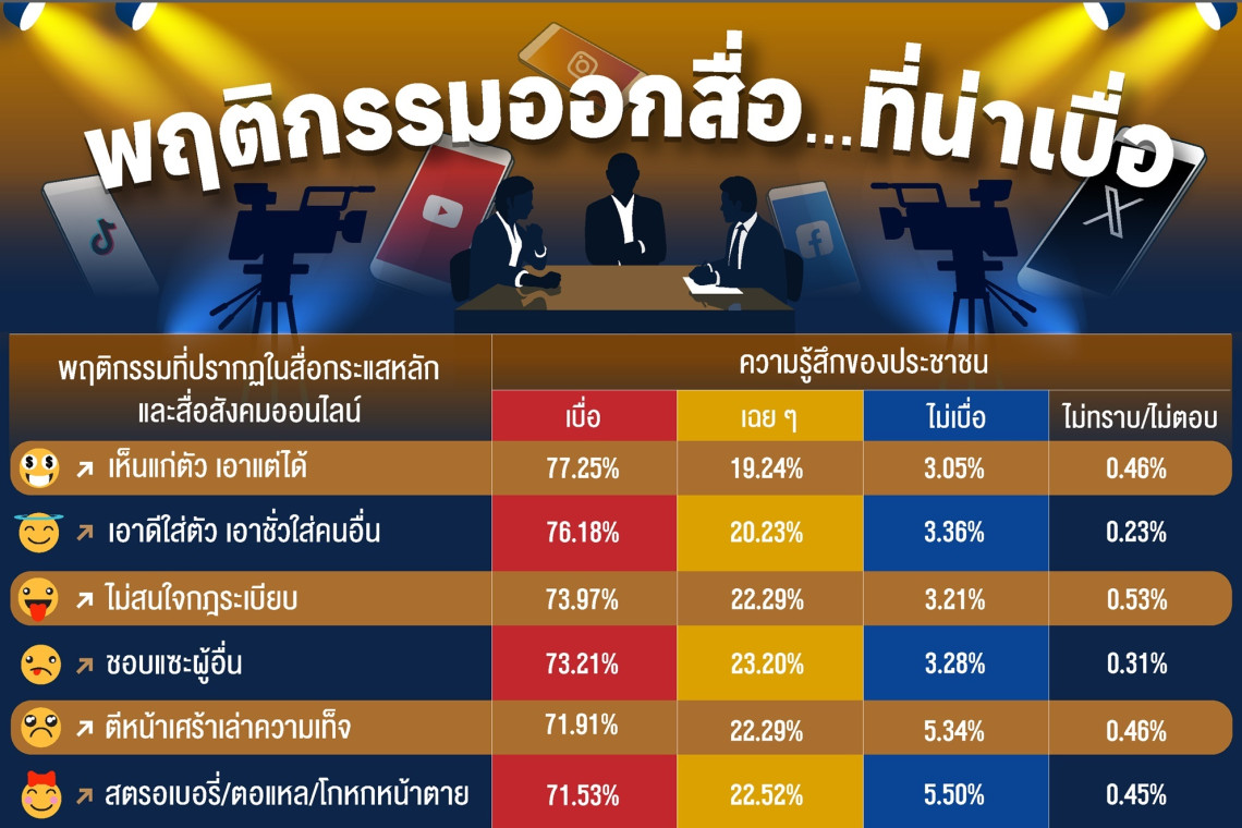 จากการสำรวจเมื่อถามถึงความรู้สึกของประชาชนต่อพฤติกรรมที่ปรากฏในสื่อกระแสหลักหรือสื่อสังคมออนไลน์ พบว่า