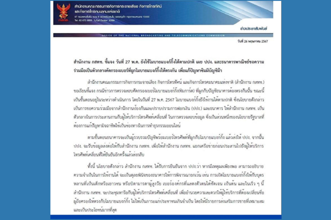 ล่าสุด สำนักงานคณะกรรมการกิจการกระจายเสียง กิจการโทรทัศน์ และกิจการโทรคมนาคมแห่งชาติ (สำนักงาน กสทช.) ขอเรียนชี้แจง กรณีข่าวการตรวจสอบคัดกรองเบอร์โมบายแบงก์กิ้ง(ซิมการ์ด) ที่ผูกกับบัญชีธนาคารต้องตรงกันนั้น ขณะนี้เป็นขั้นตอนอยู่ในระหว่างดำเนินการ โดยในวันที่ 27 พ.ค. 2567 โมบายแบงก์กิ้งยังใช้งานได้ตามปกติ ซึ่งนโยบายดังกล่าวเป็นการขอความร่วมมือจากสำนักงานป้องกันและปราบปรามการฟอกเงิน (ปปง.) และธนาคาร ให้สำนักงาน กสทช. เป็นตัวกลางในการประสานงานกับผู้ให้บริการโทรศัพท์เคลื่อนที่ ในการตรวจสอบข้อมูล ซึ่งเป็นส่วนหนึ่งของนโยบายรัฐบาลที่ต้องการแก้ปัญหามิจฉาชีพใช้เป็นช่องทางในการทำธุรกรรมออนไลน์