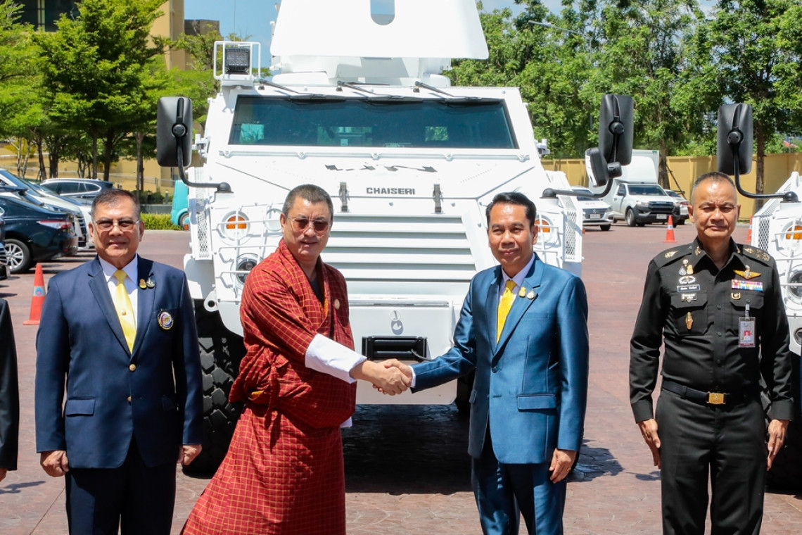 วันที่ 27 พฤษภาคม 2567 ที่อาคารสำนักงานปลัดกระทรวงกลาโหม (ศรีสมาน) นายสุทิน คลังแสง รมว.กลาโหม เป็นประธานในพิธีส่งมอบรถยานเกราะล้อยางแบบ 4x4 ของบริษัท ไทยดีเฟนส์อินดัสตรี จำกัด (TDI) และอาวุธปืน ของบริษัท อุตสาหกรรมผลิตอาวุธจำกัด (WMI) ให้กับสำนักงานตำรวจแห่งชาติ ราชอาณาจักรภูฏาน เพื่อนำไปใช้ในภารกิจรักษาสันติภาพ โดยมี พล.อ.พอพล มณีรินทร์ ประธานกรรมการสถาบันเทคโนโลยีป้องกันประเทศ พล.อ.สนิธชนก สังขจันทร์ ปลัดกระทรวงกลาโหม พล.อ.อ.ธนศักดิ์ เมตะนันท์ รองปลัดกระทรวงกลาโหม เป็นสักขีพยานกิตติมศักดิ์และผู้บริหารบริษัท TDI และ บริษัท WMI เป็นผู้ส่งมอบ ซึ่เอกอัครราชทูตราชอาณาจักรภูฏานประจำประเทศไทย ได้ให้เกียรติเป็นผู้แทน สำนักงานตำรวจแห่งชาติ ราชอาณาจักรภูฏาน ในการรับมอบครั้งนี้