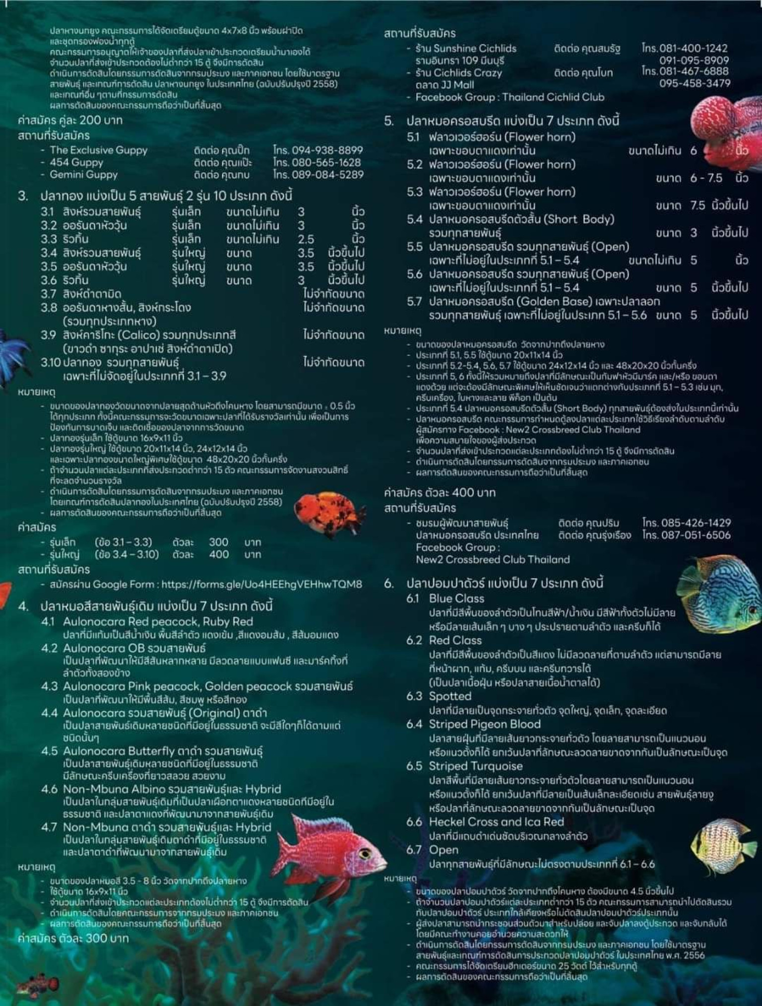 ชนิดที่ 5 ปลาหมอครอสบรีด แบ่งเป็น 7 ประเภท ดังนี้ 1. ฟลาวเวอร์ฮอร์น (Flower horn) เฉพาะขอบตาแดงเท่านั้น (ขนาดไม่เกิน 6 นิ้ว) 2. ฟลาวเวอร์ฮอร์น (Flower horn) เฉพาะขอบตาแดงเท่านั้น (ขนาด 6-7.5 นิ้ว) 3. ฟลาวเวอร์ฮอร์น (Flower horn) เฉพาะขอบตาแดงเท่านั้น (ขนาด 7.5 นิ้วขึ้นไป) 4. ปลาหมอครอสบรีดตัวสั้น (Short Body) รวมทุกสายพันธุ์ 5. ปลาหมอครอสบรีด รวมทุกสายพันธุ์ (Open) เฉพาะที่ไม่อยู่ในประเภทที่ 1–4 6. ปลาหมอครอสบรีดรวมทุกสายพันธุ์ (Open) เฉพาะที่ไม่อยู่ในประเภทที่ 1–4 7. ปลาหมอครอสบรีด (Golden Base) เฉพาะปลาลอก รวมทุกสายพันธุ์ เฉพาะที่ไม่อยู่ในประเภท 1–6 ดำเนินการตัดสินโดยกรรมการตัดสินจากกรมประมงและภาคเอกชน