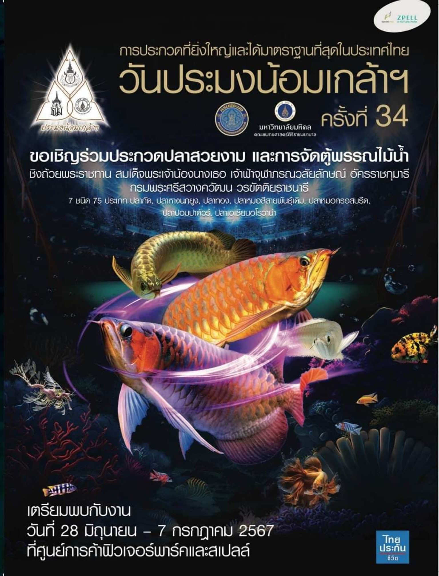 นายบัญชา สุขแก้ว อธิบดีกรมประมง เปิดเผยว่า งานวันประมงน้อมเกล้าฯ ครั้งที่ 34 ระหว่างวันที่ 28 มิถุนายน-7 กรกฎาคม 2567 ณ ศูนย์การค้าฟิวเจอร์พาร์คและสเปลล์ จัดขึ้นด้วยความร่วมมือระหว่างกรมประมง คณะแพทยศาสตร์ศิริราชพยาบาล ศูนย์การค้าฟิวเจอร์พาร์คและสเปลล์ ภาครัฐและภาคเอกชนที่เกี่ยวข้อง ภายใต้ธีม “Aquatic Arena : สนามแข่งขันประชันความงาม – ท้าประลองความแข็งแกร่งของแก๊งสัตว์น้ำ” ปีนี้มีไฮไลท์สำคัญของงาน คือ การจัดกิจกรรมประกวดปลาสวยงามและการจัดตู้พรรณไม้น้ำ “Miracle Style with Aquatic Life : อัศจรรย์กับสิ่งมีชีวิตใต้น้ำ” สามารถสมัครได้ตั้งแต่วันนี้ถึงวันที่ 7 มิถุนายน 2567 หรือจนกว่าจะเต็ม (ตู้มีจำนวนจำกัด) โดยมีการจัดการประกวดปลาสวยงามทั้งหมด 7 ชนิด 75 ประเภท การประกวดการจัดตู้พรรณไม้น้ำ 4 ประเภท ผู้ชนะการประกวดทุกประเภทจะได้รับรางวัลพระราชทานการประกวดปลาสวยงาม ถ้วยรางวัลพระราชทานสมเด็จพระเจ้าน้องนางเธอ เจ้าฟ้าจุฬาภรณวลัยลักษณ์ อัครราชกุมารี กรมพระศรีสวางควัฒน วรขัตติยราชนารี และถ้วยประทานพระเจ้าวรวงศ์เธอ พระองค์เจ้าสิริภาจุฑาภรณ์ สำหรับผู้ชนะการประกวดประเภท 1. ปลากัดจูเนียร์ครีบสั้น รวมทุกประเภทหางสีเดียว 2. ปลากัดจูเนียร์ครีบสั้น รวมทุกประเภทหางสีผสม 3. ปลากัดจูเนียร์ครีบยาว รวมทุกประเภทหางและสี 4. ปลาหางนกยูง ประเภท Juvenile Solid 5. ปลาหางนกยูง ประเภท Juvenile Pattern และรางวัลการประกวดการจัดตู้พรรณไม้น้ำ ประเภทจัดสด