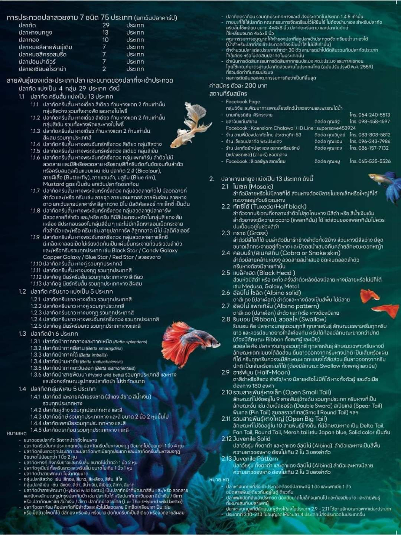 สำหรับการประกวดปลาสวยงาม 7 ชนิด 75 ประเภท (ยกเว้นปลาคาร์ป) แบ่งเป็น