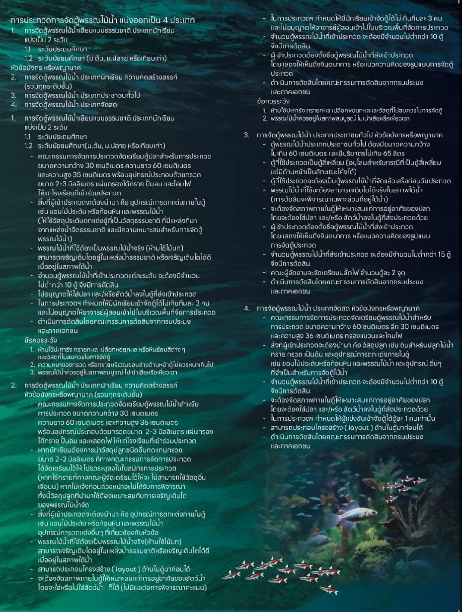 1. การจัดตู้พรรณไม้น้ำเลียนแบบธรรมชาติประเภทนักเรียน แบ่งเป็น 2 ระดับ คือ 1. ระดับประถมศึกษา 2. ระดับมัธยมศึกษา (ม.ต้น, ม.ปลาย หรือเทียบเท่า)