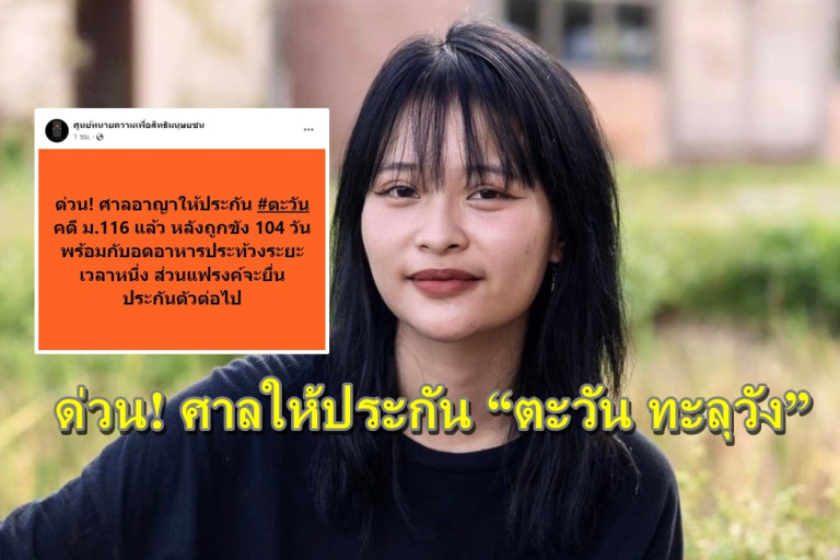 27 พฤษภาคม 2567 17:11 น. สยามรัฐออนไลน์ อาชญากรรม เมื่อวันที่ 27 พ.ค.67 ผู้สื่อข่าวรายงานว่า แฟนเพจ “ศูนย์ทนายความเพื่อสิทธิมนุษยชน” โพสต์เฟสบุ๊ค ระบุว่า ด่วน! ศาลอาญาให้ประกัน #ตะวัน คดี ม.116 แล้ว หลังถูกขัง 104 วัน พร้อมกับอดอาหารประท้วงระยะเวลาหนึ่ง ส่วนแฟรงค์จะยื่นประกันตัวต่อไป