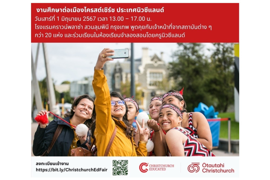 หน่วยงานการศึกษานิวซีแลนด์ (Education New Zealand; ENZ) สถานทูตนิวซีแลนด์ ประจำประเทศไทย ขอเชิญนักเรียน นักศึกษา ผู้ปกครองและผู้สนใจ ร่วมงานศึกษาต่อเมืองไครสต์เชิร์ช ประเทศนิวซีแลนด์ (Study in Christchurch Education Fair) งานแนะแนวให้คำปรึกษา พบปะพูดคุยกับเจ้าหน้าที่จากสถาบันและโรงเรียนกว่า 20 แห่ง อาทิ โรงเรียนมัธยม (รัฐบาล และ เอกชน) มหาวิทยาลัย สถาบันภาษา สถาบันเทคโนโลยี และสถาบันเอกชนเฉพาะทางต่างๆ พร้อมเปิดประสบการณ์สัมผัสห้องเรียนจำลองนิวซีแลนด์ ร่วมเรียนในห้องเรียนจำลอง (ฟรี) สอนโดยครูนิวซีแลนด์หัวข้อ Experience a New Zealand High School Classroom (STEM) และ Designing Tomorrow: Sustainable Spaces for a Brighter Future น้องๆจะได้ทดสอบแก้โจทย์ที่ท้าทาย เรียนรู้การออกแบบระดับโลก และการทำงานเป็นทีม ทั้งนี้กิจกรรมห้องเรียนจำลองมี 2 รอบ เหมาะกับนักเรียนอายุ 12 ปีขึ้นไป โดยไม่จำเป็นต้องมีพื้นฐานภาษาอังกฤษ จำกัดเพียง 60 คน ต่อรอบ (ลงทะเบียนทดลองเรียนห้องเรียนจำลองที่หน้างานเท่านั้น)