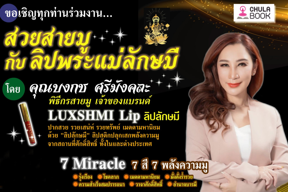 ศูนย์หนังสือจุฬาลงกรณ์มหาวิทยาลัย ขอเชิญร่วมงาน “สวยสายมู กับ ลิปพระแม่ลักษมี” โดย คุณบงกช ศรีมังคละ พิธีกรสายมู เจ้าของแบรนด์ LUXSHME Lip เปิดตัว 7 Miracle ปากสวย รวยเสน่ห์ รับทรัพย์ ด้วยลิปสติกปลุกเสกพลังความมูจากสถานที่ศักดิ์สิทธิ์ทั่วประเทศ พร้อมพูดคุยกับนักพยากรณ์ ชื่อดังจากรายการบ้านโหราศาสตร์ ช่อง MVTV อาทิ ดร.ประกาย ณ สงขลา นายกสมาคมโหราศาสตร์สากล อาจารย์จุฑามาศ ณ สงขลา ผู้เชี่ยวชาญด้านพลังหินบำบัด อาจารย์มุ่ย หูทิพย์ อาจารย์หมิง คนเปิดกรรม อาจารย์ฝน ไพ่พรหมญาณ และอาจารย์กะทิ ไพ่พรหมญาณ ปิดท้ายด้วยการสาธิตแต่งหน้าเสริมเสน่ห์ โดย Makeup Artist ชื่อดัง อาจารย์ชัยยงค์ แก้วกัน (อ.ชัย เมคอัพ) และ ครูลิลลี่ วัชรี ไชยศักดิ์