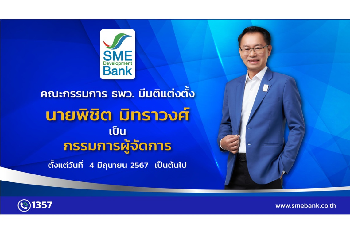 คณะกรรมการธนาคารพัฒนาวิสาหกิจขนาดกลางและขนาดย่อมแห่งประเทศไทย (ธพว.) หรือ SME D Bank มีมติเมื่อวันที่ 23 พฤษภาคม 2567 อนุมัติแต่งตั้งให้ นายพิชิต มิทราวงศ์ เป็น “กรรมการผู้จัดการ” โดยผ่านความเห็นชอบจากธนาคารแห่งประเทศไทย (ธปท.) และกระทรวงการคลังเรียบร้อยแล้ว มีผลตั้งแต่วันที่ 4 มิถุนายน 2567 เป็นต้นไป