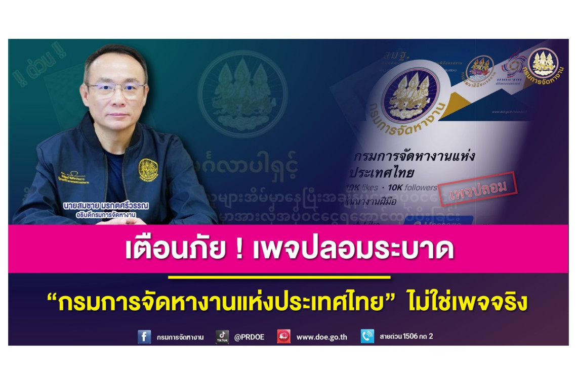 กรมการจัดหางานเตือนอย่าหลงเชื่อผู้แอบอ้างใช้ชื่อ กรมการจัดหางานแห่งประเทศไทย ย้ำเป็นเพจปลอม หวั่นประชาชนถูกหลอก พร้อมดำเนินคดีถึงที่สุด