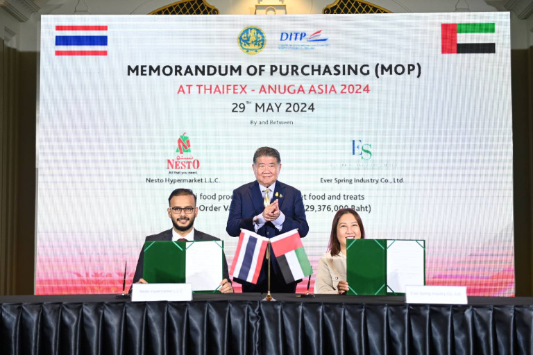 นายภูมิธรรม เวชยชัย รองนายกรัฐมนตรีและ รมว.พาณิชย์ เปิดเผยภายหลังเป็นสักขีพยานในพิธีลงนามซื้อขายสินค้า(Memorandum of Purchase :MOP) ระหว่างบริษัทไทยและสหรัฐอาหรับเอมิเรตส์(ยูเออี) ในช่วงระหว่างงาน THAIFEX-ANUGA ASIA 2024 โดยมีตัวแทนจากบริษัท Nesto Hypermarket L.L.C. ตัวแทนจากบริษัท Ever Spring Industry Co., Ltd. เข้าทำสัญญา ทั้งนี้ในช่วงต้นปีที่ผ่านมานายภูมิธรรม ได้เดินไปยังสหรัฐอาหรับเอมิเรตส์ เพื่อติดตามผลการประชุมรัฐมนตรีองค์การการค้าโลกสมัยสามัญ ครั้งที่ 13 และได้หารือกับผู้ประกอบการไทย เป็นที่มาของการลงนามบันทึกข้อตกลงการสั่งซื้อในวันนี้ ด้วยมูลค้าสั่งซื้อทันทีกว่า 40 ล้านบาท และประมาณการการสั่งซื้อภายในปีนี้กว่า 100 ล้านบาท