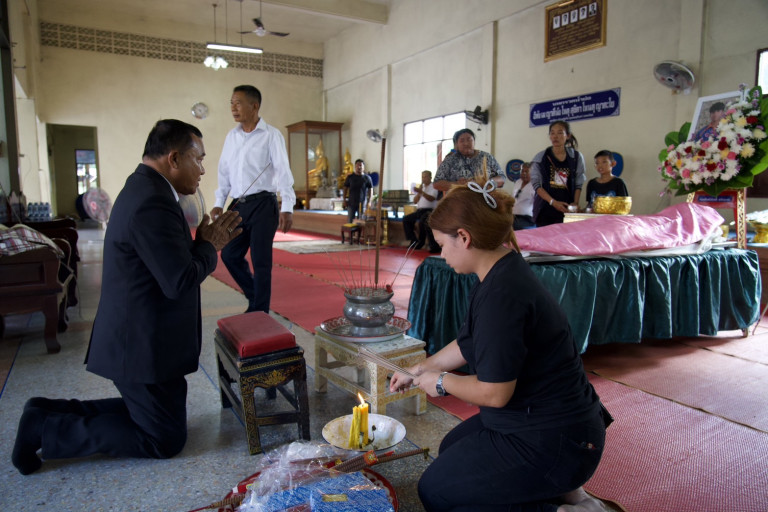 โดยบรรยากาศงานรดน้ำศพ นายอาทิตย์ อายุ 40 ปี บิดาได้นำร่างของนายอัครวินท์ แก้วธรรม มาทำพิธีทางศาสนาที่วัดโพธิ์นิ่มรัตตาราม(วัดคลองขุด) โดยมีนายชาญ พวงเพ็ชร์ และนายเสวก ประเสริฐสุข ร่วมรดน้ำศพและแสดงความเสียใจกับครอบครัวผู้เสียชีวิต โดยบรรยากาศเป็นไปด้วยความโศกเศร้า