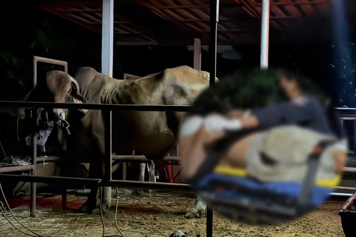 จากการสอบถามชาวบ้านเล่าว่าวัวสองตัวได้ชนกันแล้วคนเลี้ยงเข้าไปห้ามก่อนวัวจะได้ทุ่มเข้ากำแพงจนกระเด็นข้ามมาอีกคอกวัวที่อยู่ข้างกัน ก่อนจะคลานออกมานอนขอความช่วยเหลือข้างคอก ดังกล่าว