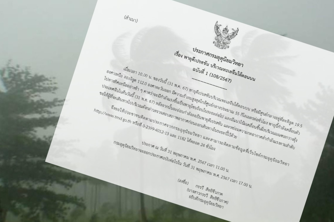 วันที่ 31 พ.ค.67กรมอุตุนิยมวิทยา ประกาศ เรื่อง พายุดีเปรสชัน บริเวณทะเลจีนใต้ตอนบนฉบับที่ 1 (108/2567)