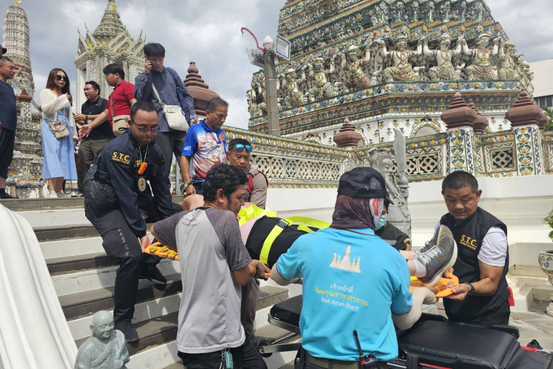 วันที่ 31 พ.ค.67 ที่วัดอรุณพ.ต.ท จิรพัฒน์ เขียวศิริ รอง ผกก.1ฯ รรท.สวญ.สถานีตำรวจท่องเที่ยวธนบุรี พร้อมด้วยตำรวจชุดชุมชนท่องเที่ยวเข้มแข็ง S.T.C.ส.ทท.3ฯ ระหว่างปฏิบัติหน้าที่ดูแลความปบอดภัยอำนวจความสะดวกนักท่องเที่ยว ได้รับแจ้งจากเจ้าหน้าที่วัดว่ามีนักท่องเที่ยวชาวจีน ชื่อ Mrs. XUN XIAOHANG อายุ 50 ปี พลัดตกบันได จึงเข้าให้การช่วยเหลือ พร้อมด้วย ร.ต.อ.สมโภชฯ รอง สว.จร.บางกอกใหญ่ ประสานรถกู้ชีพวิชัยเวช นำส่ง รพ.สมเด็จพระเจ้าตากสิน 1 เพื่อดูอาการได้รับความขอบคุณจากนักท่องเที่ยวและญาติของนักท่องเที่ยว