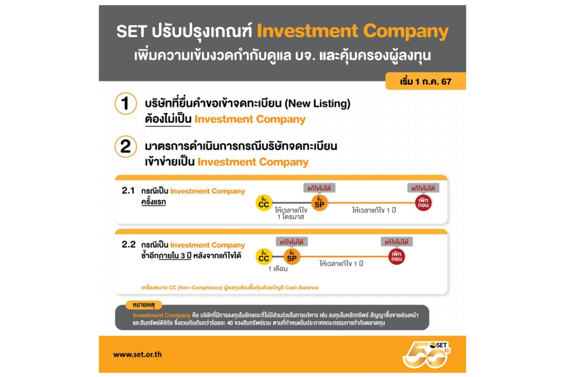 ตลาดหลักทรัพย์ฯ ปรับปรุงเกณฑ์เกี่ยวกับการประกอบธุรกิจของบริษัทจดทะเบียนที่ต้องไม่มีลักษณะเป็นการบริหารจัดการเงินลงทุน (Investment Company) ตั้งแต่การรับบริษัทที่จะเข้าจดทะเบียน จนถึงการกำกับดูแลบริษัทจดทะเบียน ให้มีความสอดคล้องกันกับหลักเกณฑ์ของสำนักงาน ก.ล.ต. โดยกำหนดให้บริษัทที่ยื่นคำขอเข้าจดทะเบียน และบริษัทจดทะเบียนที่อยู่ใน SET และ mai ต้องไม่มีการดำเนินงานในลักษณะที่เป็น Investment Company หากบริษัทจดทะเบียนมีลักษณะการดำเนินงานดังกล่าว ตลาดหลักทรัพย์ฯ จะขึ้นเครื่องหมาย CC (Non-Compliance) เพื่อเตือนให้ผู้ลงทุนเพิ่มความระมัดระวังในการซื้อขายหลักทรัพย์จดทะเบียนของบริษัทดังกล่าว และหากบริษัทจดทะเบียนนั้นไม่สามารถแก้ไขลักษณะดังกล่าวได้ภายในระยะเวลาที่กำหนด ตลาดหลักทรัพย์ฯ จะขึ้นเครื่องหมาย SP (Trading Suspension) ตามระยะเวลาที่กำหนด และอาจพิจารณาเพิกถอนหลักทรัพย์จดทะเบียน ตามลำดับ ซึ่งการกำหนดมาตรการดังกล่าวเป็นการเพิ่มความเข้มงวดและประสิทธิภาพในการกำกับดูแลบริษัทจดทะเบียน ตลอดจนเพื่อคุ้มครองประโยชน์ของผู้ลงทุน ตามแผนกลยุทธ์ของตลาดหลักทรัพย์ฯ ด้านยกระดับความเชื่อมั่นตลาดทุน