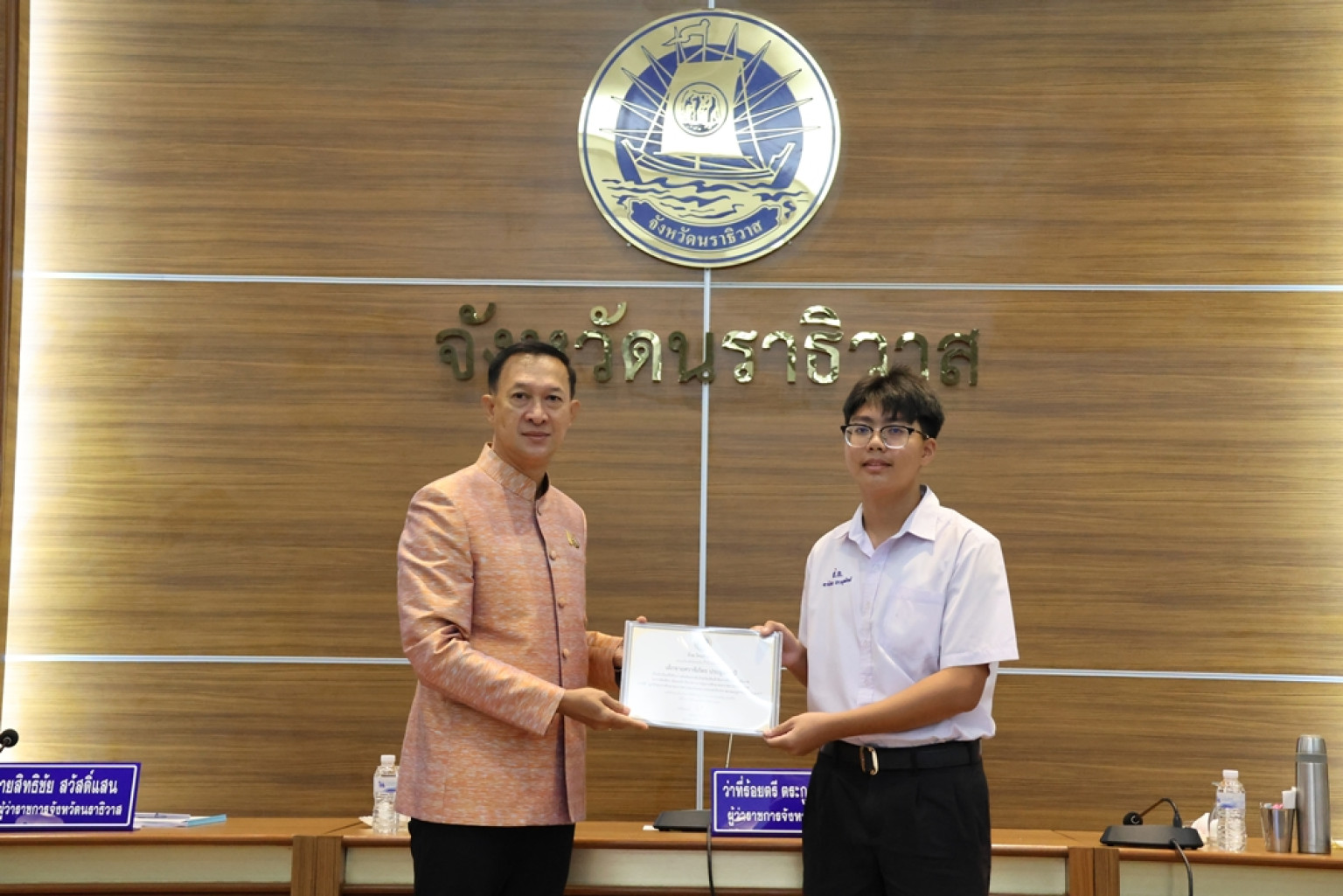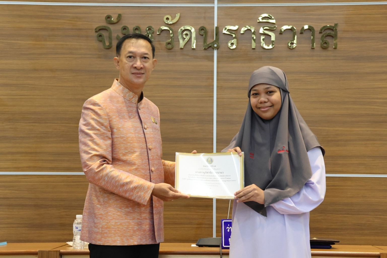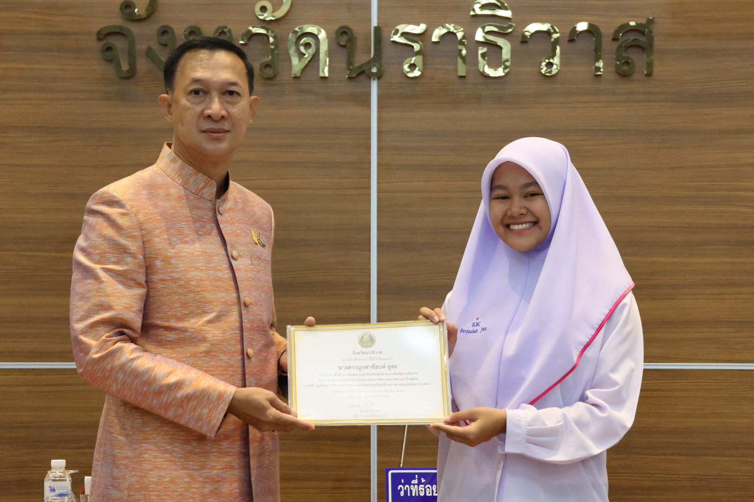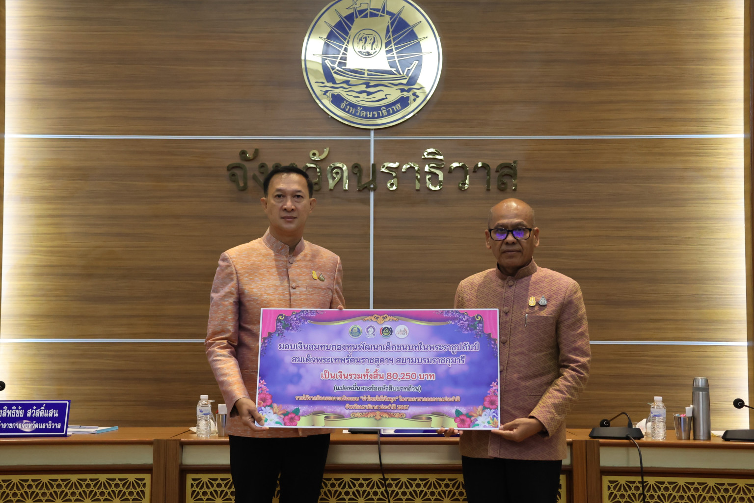 ในการนี้ผู้ว่าราชการจังหวัดนราธิวาส ประธานในพิธีได้มอบการมอบโล่ประกาศเกียรติคุณ “วุฒิสภา ศรัทธาความดี” ให้แก่ผู้ทำความดีเพื่อสังคม และรับมอบเงินรายได้จากการเดินแบบ “ผ้าไทยใส่ให้สนุก” เพื่ออนุรักษ์ภูมิปัญญาผ้านราธิวาส เพื่อนำเข้าสมทบกองทุนพัฒนาเด็กชนบทในพระราชูปถัมป์ สมเด็จพระเทพรัตนราชสุดา ฯ สยามบรมราชกุมารี ซึ่งจะช่วยเหลือเด็กแรกเกิด ถึง 6 ปี ที่มีฐานะยากจนให้มีคุณภาพชีวิตดีขึ้น นอกจากนี้ ผู้ว่าราชการจังหวัดนราธิวาส ยังได้มอบเกียรติบัตรนักเรียนที่ผ่านการคัดเลือกโครงการทุนการศึกษาพระราชทานฯ ปี 2567 ภายใต้ “มูลนิธิทุนการศึกษาพระราชทาน สมเด็จพระบรมโอรสาธิราช”