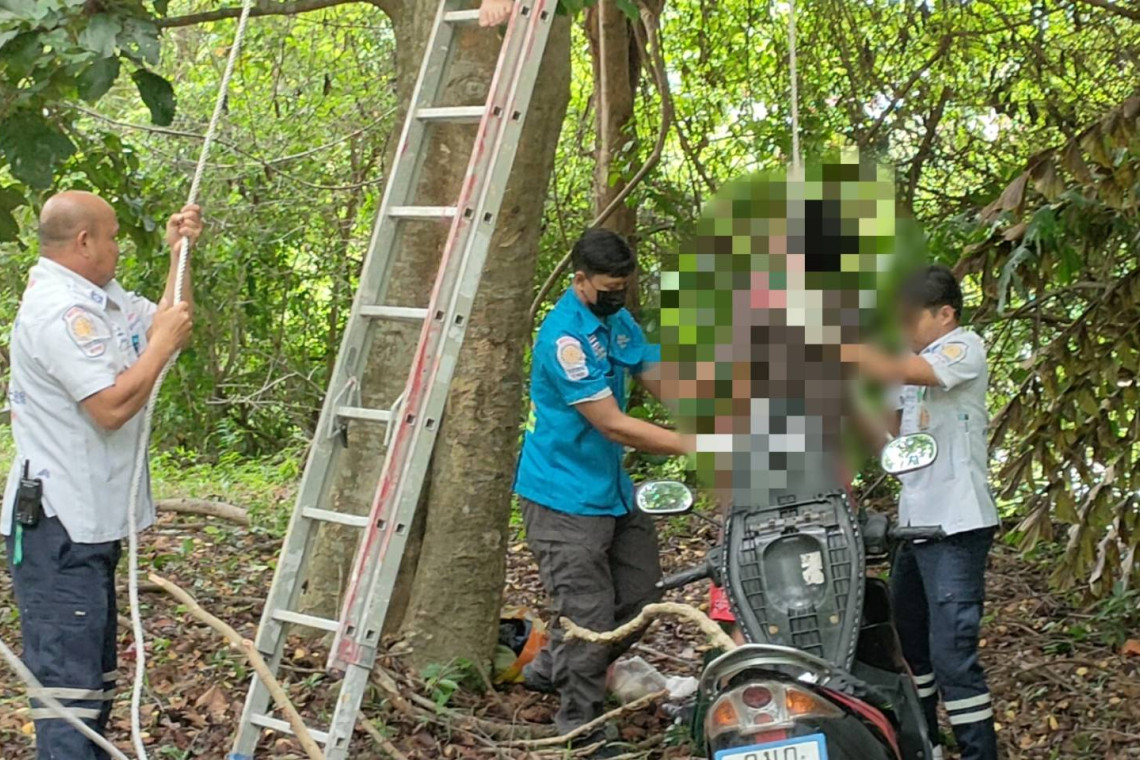ในที่เกิดเหตุบริเวณริมถนน สองข้างทางปกคลุมด้วยต้นไม้ใหญ่หลากหลายชนิด ที่ต้นกระท้อนขนาดใหญ่พบศพร่างชายใช้ผ้าห่มผูกต่อกับผ้าขาวม้าผูกคอกับกิ่งกระท้อน ห้อยโตงเตงอยู่ สูงจากพิ้นดิน5-6เมตร โดยทางเจ้าหน้าที่ตำรวจพิศูจน์หลักฐานก็ได้เข้าตรวจสอบที่เกิดเหตุพร้อมถ่ายภาพ เก็บหลักฐานในที่เกิดเหตุก่อนให้ทางเจ้าหน้าที่มูลนิธิฯใช้บรรใดปีนขึ้นไปคล้องตัวนำร่างลงมาให้เเพทย์ฯชันสูตรด้านล่าง โดยสภาพศพสวมเสื้อยืดสีเทา กางเกงขาสั้นสีเเดง ตรวจสอบไม่พบบาดแผลแต่อย่างใด คาดเสียชีวิตมาเเล้ว 8-12 ชม. จากการตรวจสอบบริเวณที่โคนต้นกระท้อนดังกล่าว ยังพบรองเท้าเตะ1คู่ มีกระติกน้ำ ถุงเสื้อผ้าและเสื้อแขนยาววางอยู่ ใกล้ๆกันพบรถจักรยานยนต์ยามาฮ่า GTXสีดำ หมายเลขทะเบียน คมก xxx นศ. จอดอยู่ใสสภาพกุญเเจยังเสียบค่าอยู่ที่รถ ทางเจ้าหน้าที่ตรวจสอบเอกสารใต้เบาะรถระบุชื่อ นายสุภัทร์ชัย อายุ 30 ปี ชาวจ.สตูล