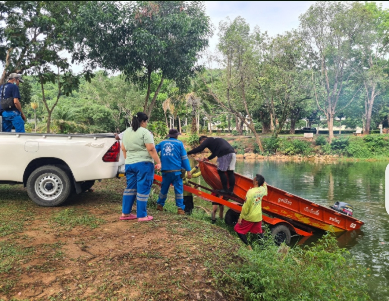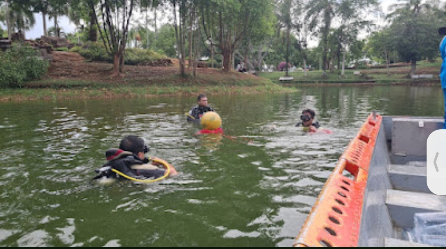 นักท่องเที่ยวกลุ่มนี้จึงแจ้งขอความช่วยเหลือกับเจ้าหน้าที่สวนสาธารณะและมีการประสานต่อไปยังเจ้าหน้าที่กู้ภัยมูลนิธิมิตรภาพสามัคคี(ท่งเซียเซี่ยงตึ้ง)หาดใหญ่ เพื่อขอนักประดาน้ำมาช่วยดำน้ำค้นหาโดรน