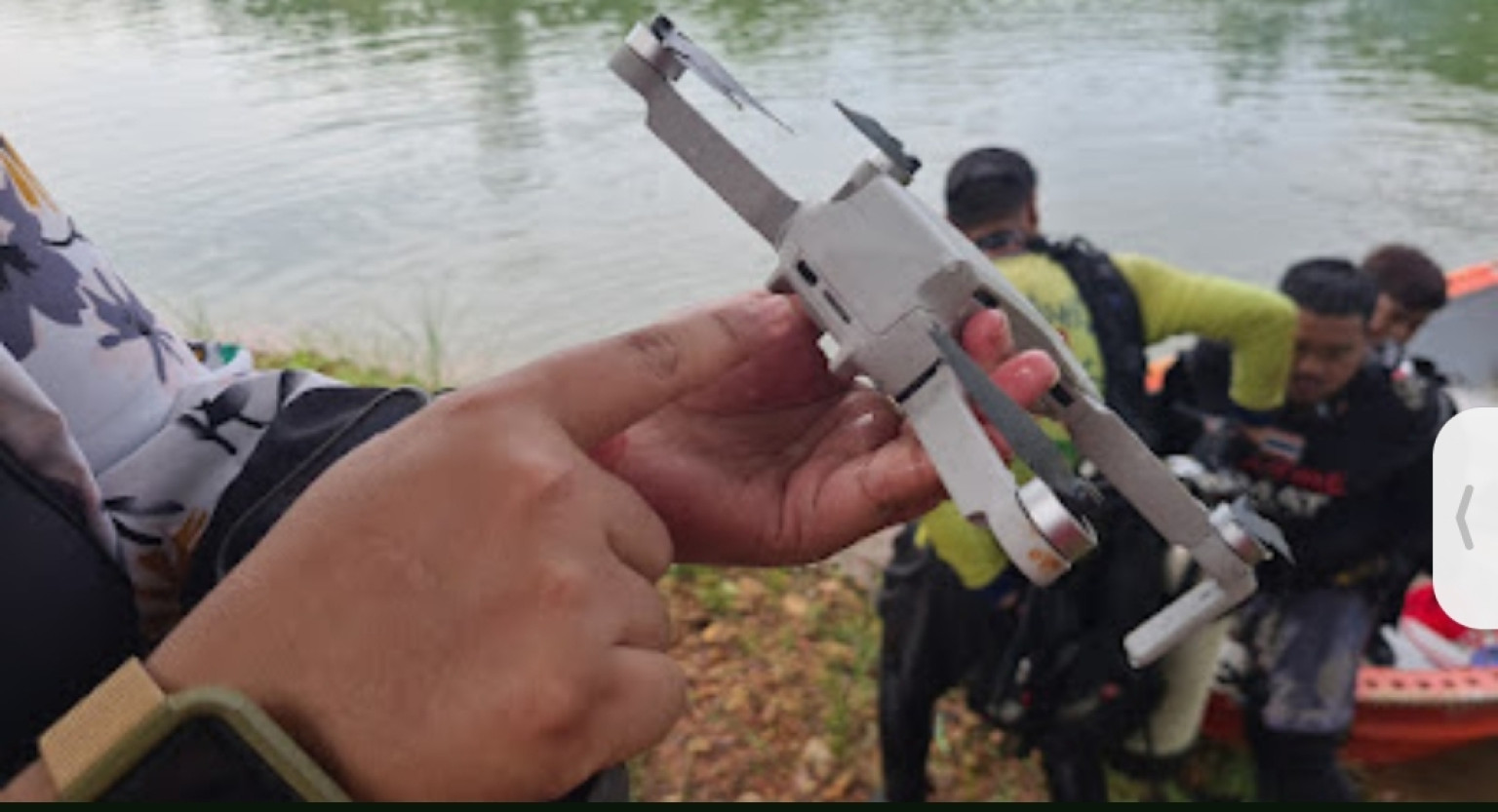 และทางมูลนิธิมิตรภาพสามัคคีหาดใหญ่ ก็ได้ส่งทีมนักประดาน้ำจำนวน 4 นายมาช่วยเหลือทันที โดยปฏิบัติการค้นหาโดรนลำนี้้ใช้เวลากว่า 5 ชั่วโมง ตั้งแต่ช่วง 10 โมงเช้า จนถึงประมาณบ่าย3โมงครึ่ง ก็พบโดรนลำนี้จมอยู่ใกล้กับสะพานแขวนเกาะกลางน้ำที่อยู่ลึกลงไปราว2เมตร