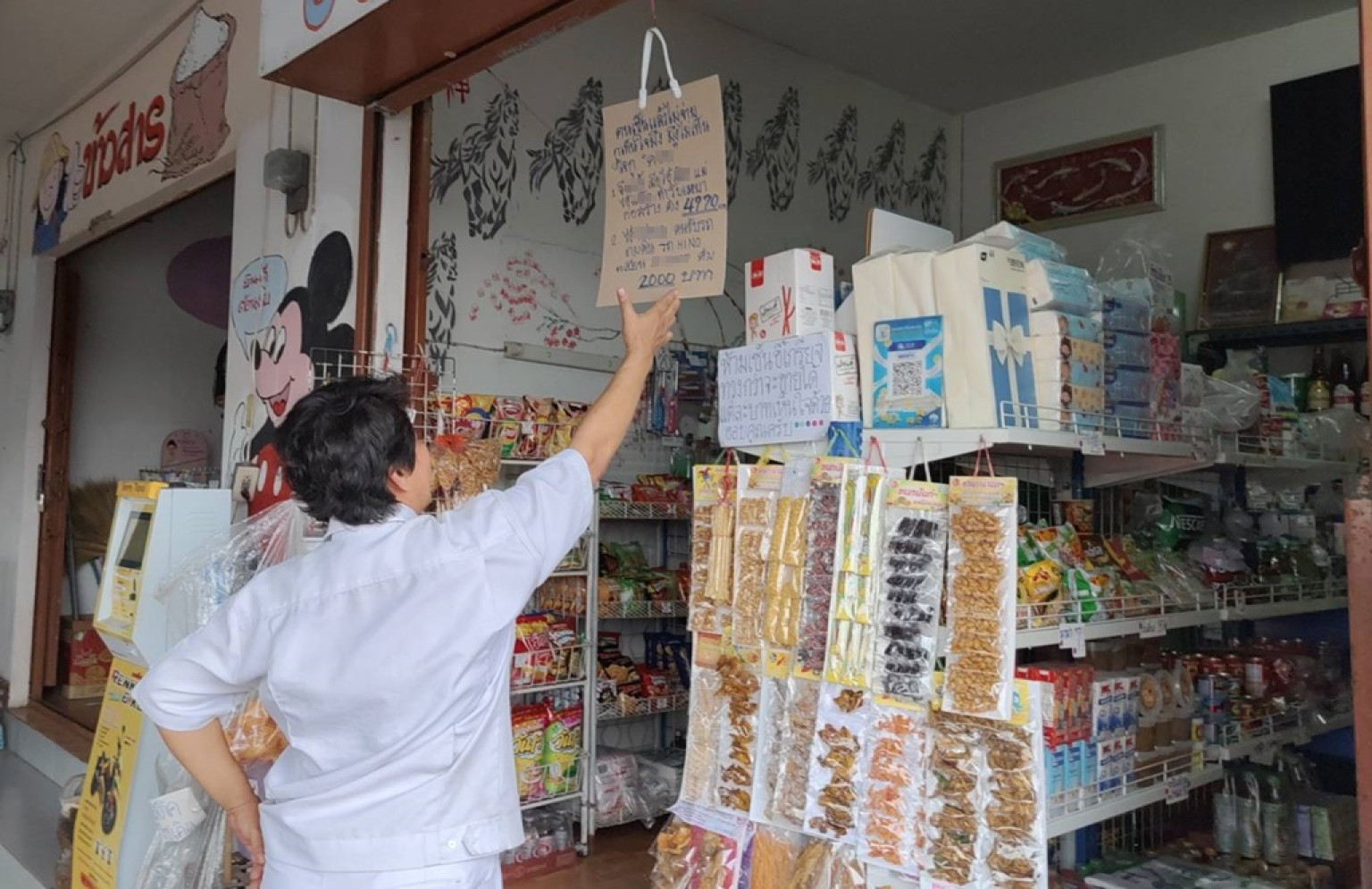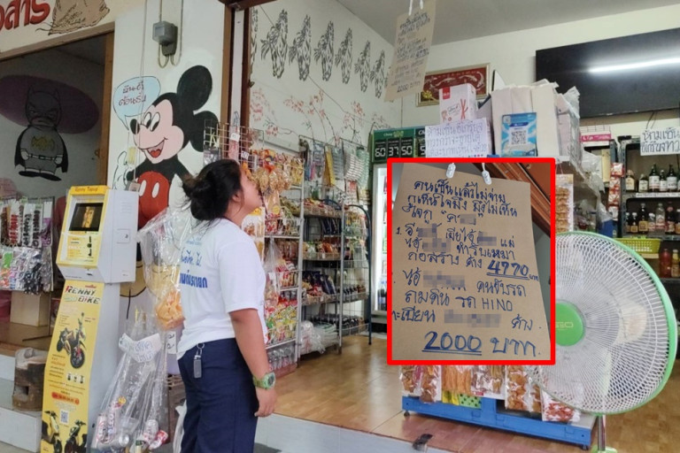 วันที่ 4 มิ.ย.67 ผู้สื่อข่าวรายงานว่าบริเวณบ้านหลังหนึ่ง หมู่ 12 ต.พรหมณี อ.เมือง จ.นครนายก เป็นอาคารพาณิชย์ชั้นเดียวเปิดเป็นร้านขายของชำ ใช้ชี่อว่า ชัยพรเบ็ดเตล็ด ภายในร้านก็จะมีของขายหลายอย่าง เช่น ข้าวสาร อาหารแห้ง , น้ำดื่ม ขนม ฯลฯ .. และยังมีป้ายทวงหนี้ถึง 2ป้าย แต่ที่ทำให้ลูกค้าที่เข้ามาซื้อร้านนี้ต้องสะดุดตากับป้ายกระดาษที่แกว่งไปมาและมีถ้อยคำว่า