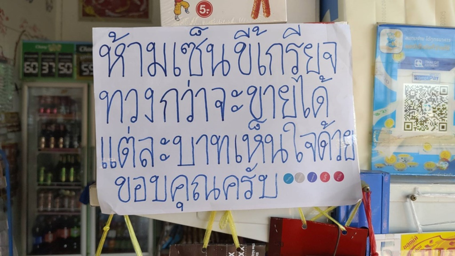 ต่อมาผู้สื่่อข่าวได้พบกัยนายไชยพร สวัสดี อายุ 63 ปี เจ้าของร้านและเป็นผู้ที่เขียนป้ายทวงหนี้เล่าให้ฟังว่า เปิดร้านขายของมาหลายปี ก็เจอลูกค้าทุกรูปแบบ มาเชื่อขอเซ็นเราก็ให้ 3-4 วันจ่ายก็มี ขอแค่คนที่มีสัจจะเท่านั้นพอ และเหตุที่ตนเขียนป้ายทวงหนี้ก็ไม่ได้อะไรหรอกเพราะคิดว่ายังไงก็คงไม่ได้คืนเพราะทั้ง 2 คนนี้ติดต่อไม่ได้แล้ว และที่เขียนก็ไม่ได้ว่าใครแต่แค่อยากจะป้องปรามเอาไว้เพื่อไม่ให้คนที่จะมาเซ็นอีก จริงๆ เราก็ไม่ได้ใจไม้ไส้ระกำอะไรขนาดนั้นหรอกใครไม่มีเราก็ให้เซ็นขอแค่คนที่รักษาคำพูดกับเรา เราก็ให้เซ็น บางคนมาไม่มีตังค์มาเลยขอติดไว้ก่อนวันนั้นวันนี้จ่ายเราก็ไม่ว่าให้ไม่ได้โหดร้ายขนาดนั้น แต่ที่ติดป้ายแบบนี้อยากจะให้คนที่รู้จัก 2 คนนี้ และฝากไปบอกด้วยว่าถ้ามีก็มีทยอยใช้หนี้บ้างเพราะขายของมันก็ได้กำไรอะไรมากมายเราเองก็ลงทุนเและก็อย่าไปทำแบบนี้กับร้านไหนอีกใจเค้่าใจเราเพราะทุกอย่างมันมีต้นทุน