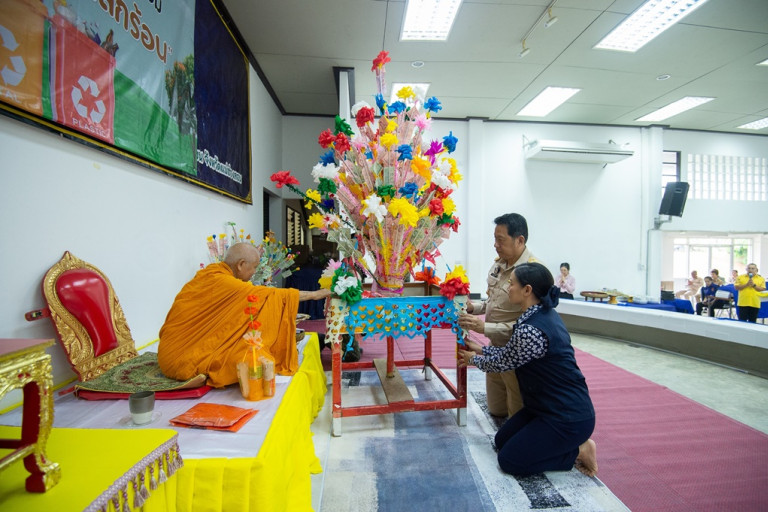 วันที่ 5 มิ.ย.67 เวลา 08.30 น. นายสังคม คัดเชียงแสน นายอำเภอเมืองแม่ฮ่องสอน และนางวิลาวัณย์ คัดเชียงแสน รองนายกเหล่ากาชาดจังหวัดแม่ฮ่องสอน/คณะกรรมการแม่บ้านมหาดไทยจังหวัดแม่ฮ่องสอน เป็นประธานในพิธีทอดผ้าป่าขยะ ณ หอประชุมอำเภอเมือง จังหวัดแม่ฮ่องสอน มีกำนัน ผู้ใหญ่บ้าน พี่น้องประชาชน จาก 7 ตำบล 68 หมู่บ้าน นำผ้าป่าขยะเข้าร่วมขบวนแห่ ซึ่งส่วนใหญ่เป็นขวดพลาสติก และกระป๋องเครื่องดื่มที่ทำจากอลูมีเนียม นำขบวนเข้าร่วมพิธี โดยพระครูอนุกูลศีลสังวร เจ้าคณะตำบลผาบ่อง เจ้าอาวาสวัดผาบ่องใต้ เป็นประธานฝ่ายสงฆ์