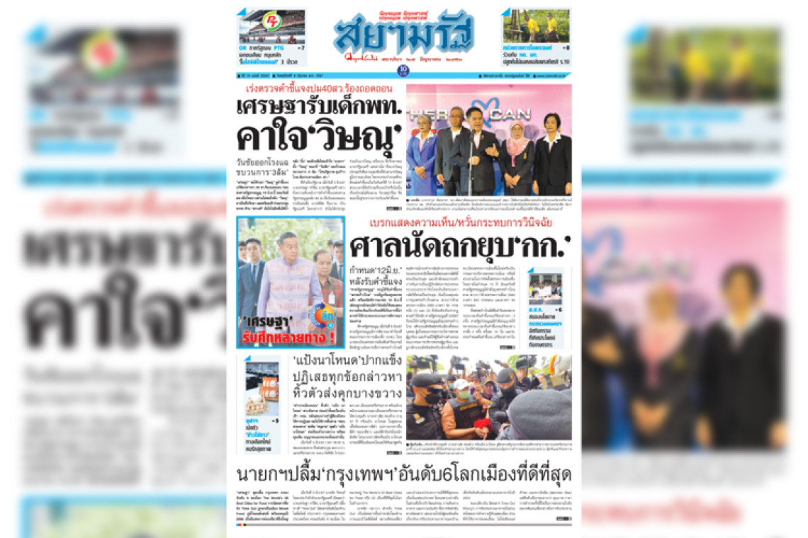 หน้า 1 หนังสือพิมพ์สยามรัฐรายวัน ฉบับวันพฤหัสบดีที่ 6 มิถุนายน 2567