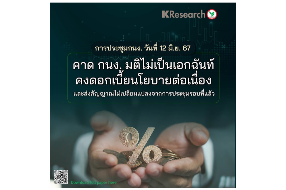 ศูนย์วิจัยกสิกรไทย ระบุในการประชุม กนง.วันที่ 12 มิ.ย.67 คาดกนง. ยังมีมติไม่เป็นเอกฉันท์คงอัตราดอกเบี้ยนโยบายที่ระดับ 2.50% ต่อเนื่อง และมีแนวโน้มส่งสัญญาณไม่แตกต่างจากผลการประชุมรอบที่แล้ว