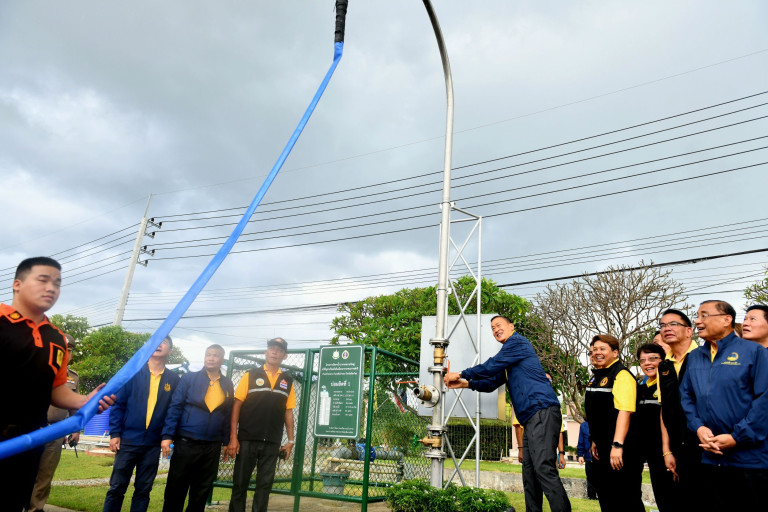 ก่อนนายกฯ ได้มอบแกลอนบรรจุน้ำ จากกรมทรัพยากรน้ำบาดาล กระทรวงทรัพยากรธรรมชาติและสิ่งแวดล้อม ให้ตัวแทนประชาชน 6 คน และได้ร่วมถ่ายภาพที่บริเวณด้านหน้าโครงการฯ
