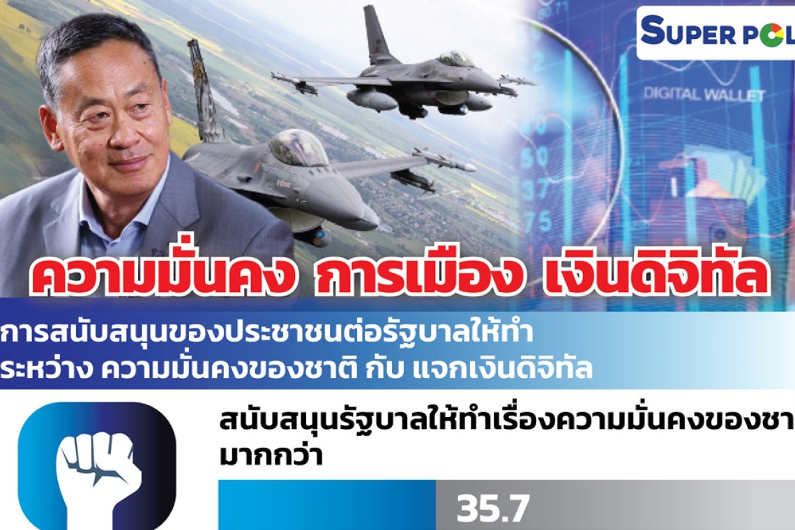 เมื่อถามถึงการสนับสนุนของประชาชนต่อรัฐบาลให้ทำ ระหว่าง ความมั่นคงของชาติ กับ แจกเงินดิจิทัล พบว่าเสียงของประชาชนแตกออกเป็น 3 กลุ่มในสัดส่วนพอ ๆ กันคือ ร้อยละ 35.7 สนับสนุนรัฐบาลให้ทำเรื่องความมั่นคงของชาติ มากกว่า ในขณะที่ ร้อยละ 31.3 สนับสนุนรัฐบาลให้แจกเงินดิจิทัล มากกว่า และร้อยละ 33.0 ไม่มีความเห็น