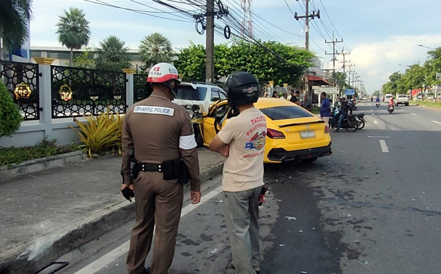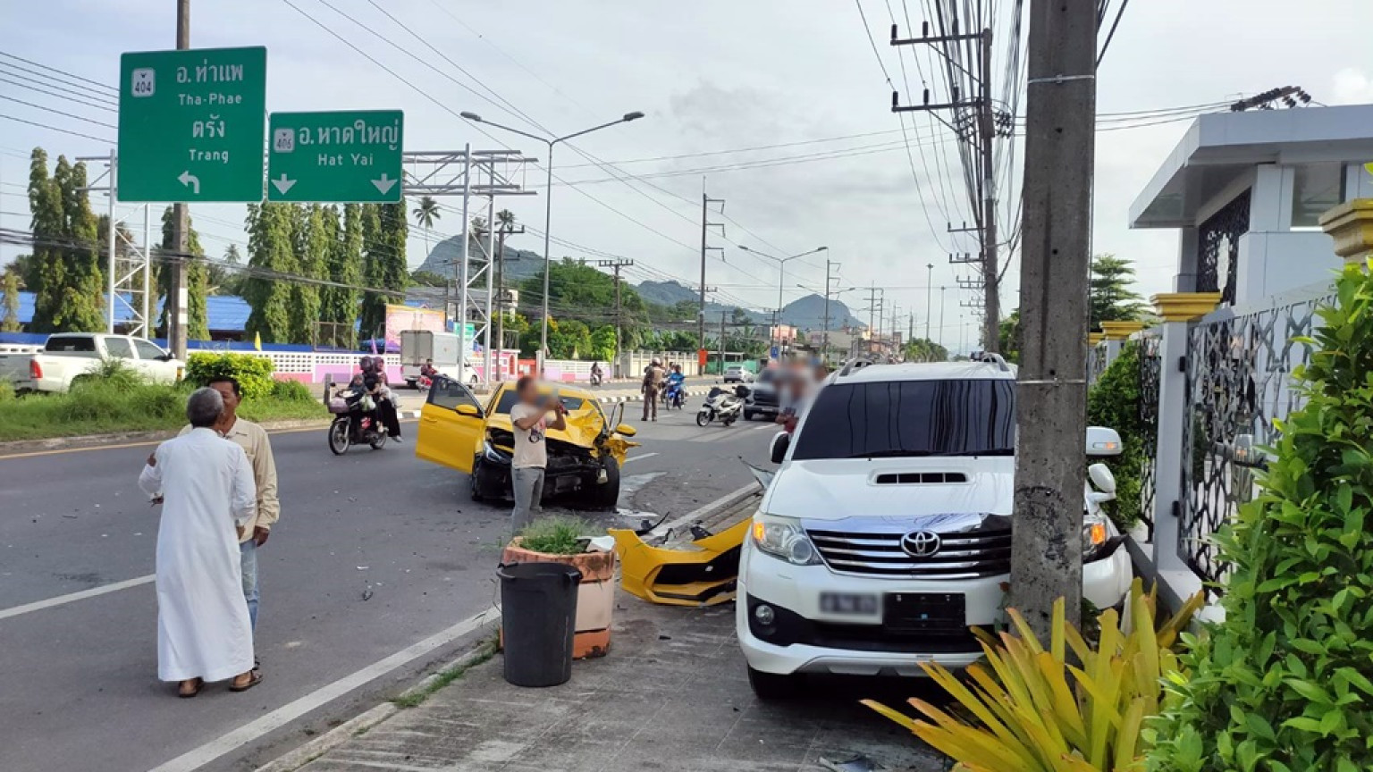 ขณะที่เจ้าหน้าที่ตำรวจ สภ.ฉลุง กำลังเร่งเก็บรวบรวมข้อมูลหลักฐานอุบัติเหตุที่เกิดขึ้นระหว่างรถ Toyota Fortuner สีขาว ทะเบียนสตูล และรถ MG สีเหลือง ทะเบียนสงขลา