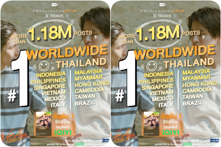 นับเป็นซีรีส์วัยรุ่นไทยที่กระแสมาแรงสุดๆ เรียกว่าปังสนั่นโซเชียลทั่วโลก สำหรับซีรีส์วัยรุ่นคุณภาพ “We Are คือเรารักกัน” จาก “GMMTV” คอนเทนต์โพรไวเดอร์ชั้นนำของเมืองไทย ที่สร้างปรากฎการณ์ทำถึงเกิน จนแฟนๆ ทั้งชาวไทยและต่างชาติพากันอินและฟินขั้นสุด พร้อมใจแห่คอมเมนต์กันแบบถล่มทลาย ใน EP.10 ถึงทีมนักแสดงสุดฮอต “ปอนด์-ณราวิชญ์ เลิศรัตน์โกสุมภ์, ภูวินทร์ ตั้งศักดิ์ยืน, วินนี่-ธนวินท์ ผลเจริญรัตน์, สตางค์-กิตติภพ เสรีวิชยสวัสดิ์, อู๋-ธนบูรณ์ เกียรตินิรันดร์, บูม-ธราธร จันทรวรกาญจน์, มาร์ค-ณฐริศร์ วรกรเลิศสิทธิ์, ปูน มิตรภักดี” และทีมนักแสดงมากฝีมือ “ไซซี-รัตท์ริชา ประภากิติ, เจเจ-ชยกร จุฑามาศ, ธี-ธีรเดช วิถีพานิชย์, ไตเติ้ล-กีรติ พวงมาลี, เปปเปอร์-ภานุโรจน์ เฉลิมกิจพรทวี, อาร์ม-วีรยุทธ จันทร์สุข, ก๊อตจิ-ทัชชกร บุญลัภยานันท์, นะ-ธนบูลย์ วัลลภศิรินันท์, แชมป์-ณัฐรัชต์ ก้อนแก้ว ฯลฯ” กับการเข้าค่ายอาสาที่เกิดเรื่องราวมากมายต่างๆ ส่งให้แฮชแท็ก #WeAreSeriesEP10 ฮอตติดเทรนด์ X “อันดับ 1” ของโลก และอีก 13 พื้นที่ทั่วโลก อาทิ ไทย, อินโดนีเซีย, ฟิลิปปินส์, สิงคโปร์, เวียดนาม, เม็กซิโก, อิตาลี, มาเลเซีย, เมียนมา, กัมพูชา, บราซิล, ฮ่องกง, ไต้หวัน และมียอดโพสต์สูงถึง 1.18M โพสต์ ถือเป็นการยืนยันถึงความฮิตฟีเวอร์ของซีรีส์ “We Are คือเรารักกัน” เพราะครองแชมป์เทรนด์ X “อันดับ 1” ของโลก ติดต่อกันถึง 5 EP.ต่อเนื่อง ตั้งแต่ EP.6-EP.10 รวมทั้งยังครองตำแหน่ง “อันดับ 1” ซีรีส์ไทยยอดนิยมบนแอป iQIYI อีกด้วย