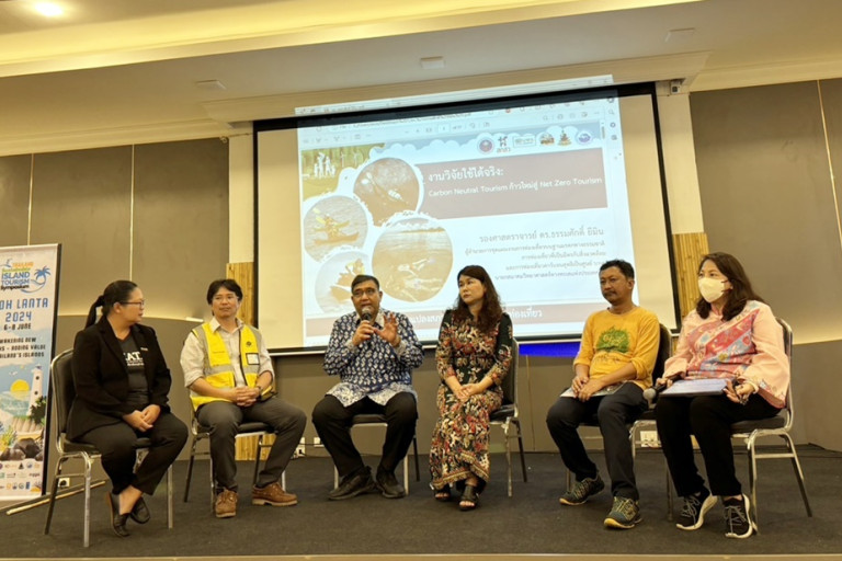 โดย ผู้ช่วยศาสตราจารย์สุภาวดี โพธิยะราช ร่วมเวทีเสวนา "ยุทธการเขย่าเกาะ ผนึกพลังคุณค่า สู่มูลค่าใหม่ของเกาะไทย" และนำเสนอเรื่อง การท่องเที่ยวเกาะคาร์บอนสุทธิเป็นศูนย์ ซึ่งดำเนินงานร่วมกับเครือข่ายทั้งในประเทศและต่างประเทศ และพัฒนาเส้นทางการท่องเที่ยวคาร์บอนสุทธิเป็นศูนย์ (CNT Routes) 183 เส้นทาง ที่สามารถขายได้ในตลาดต่างประเทศ โดยมีรูปแบบการรับรองตนเอง/มีส่วนร่วมกับคู่ค้าที่ได้รับการยอมรับในระดับสากล และจัดทำ Zero Carbon Application (PCR บริการท่องเที่ยว) ซึ่งมีผู้ใช้งานมากว่า 400 รายต่อเดือน ชดเชยคาร์บอนเฉลี่ยเดือนละ 31.5 tCO2eq (ข้อมูล พ.ย. 66 - พ.ค. 67) สนับสนุนการขายคาร์บอนเครดิตขนาดเล็กสำหรับอุตสาหกรรมการท่องเที่ยว (ตลาดคาร์บอนไทย) ขับเคลื่อนพื้นที่ 23 เกาะให้เป็น CNT Destination แบ่งเป็นเกาะในฝั่งทะเลอันดามัน 9 เกาะ ได้แก่ เกาะลันตา เกาะคอเขา เกาะพระทอง เกาะยาวใหญ่ เกาะยาวน้อย เกาะปู เกาะจัม เกาะศรีบอยา เกาะลิบง และเกาะในฝั่งอ่าวไทย 14 เกาะ คือ เกาะกุลา เกาะรางบันทัด เกาะมัดหวายใหญ่ เกาะรังกาจิว เกาะกระเต็น เกาะพะลวย เกาะเต่า เกาะสมุย เกาะพะงัน เกาะช้าง เกาะกูด เกาะหมาก เกาะหวาย เกาะระยั้ง รวมทั้งการเปลี่ยนผ่านจาก Carbon Neutral Tourism - มุ่งสู่ Net Zero Tourism สำหรับผู้ร่วมเวทีเสวนาท่านอื่น ได้แก่ นายอมฤต ศิริพรจุฑากุล ที่ปรึกษาสภาอุตสาหกรรมท่องเที่ยวจังหวัดกระบี่ ที่ปรึกษาสมาคมโรงแรมจังหวัดกระบี่ และที่ปรึกษามูลนิธิกระบี่ยั่งยืน ดร.วิจารย์ สิมาฉายา ผู้อำนวยการสถาบันสิ่งแวดล้อมไทย นางรวีวรรณ แสงจันทร์ รองผู้อำนวยการ ททท. สำนักงานกระบี่ โดยมี นายชัยวัฒน์ ถิระพันธุ์ ผู้อํานวยการสถาบันการเรียนรู้เพื่อพัฒนาประชาสังคม เป็นผู้ดำเนินการเสวนาฯ