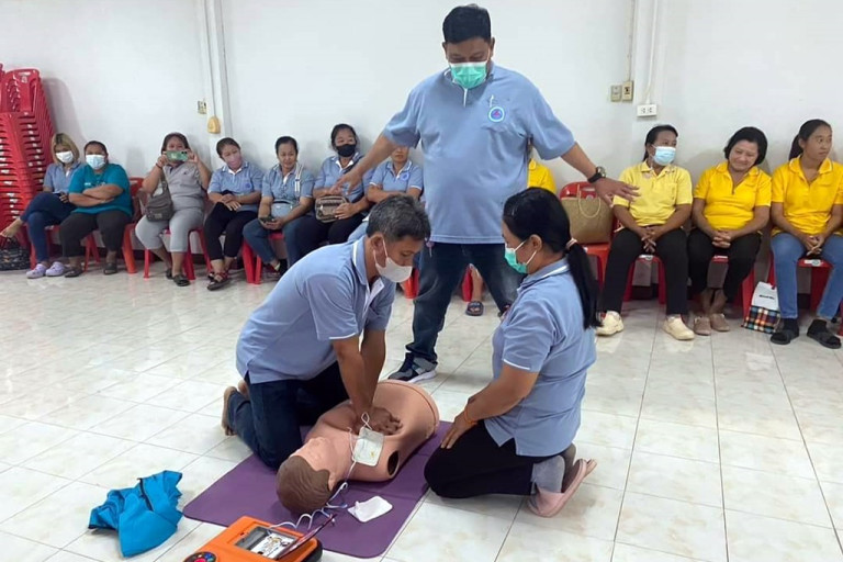 วันที่ 10 มิ.ย.67 ที่ ฃห้องประชุมองค์การบริหารส่วนตำบลหนองหรือ อำเภอหนองปรือ จังหวัดกาญจนบุรี น.พ.ปริพนท์ จุลเจิม นายแพทย์สาธารณสุขจังหวัดกาญจนบุรี มอบหมายให้ กลุ่มงานควบคุมโรคไม่ติดต่อสุขภาพจิตและยาเสพติด สำนักงานสาธารณสุขจังหวัดกาญจนบุรี จัดกิจกรรมอบรมการช่วยฟื้นคืนชีพ (CPR) และการใช้เครื่องกระตุกไฟฟ้าหัวใจ (AED) ให้กับประชาชนในพื้นที่จังหวัดกาญจนบุรี 13 อำเภอ โดยมีนายแพทย์กฤษณะ หงษาครประเสริฐผู้อำนวยการโรงพยาบาลหนองปรือ เป็นประธานเปิดการอบรม