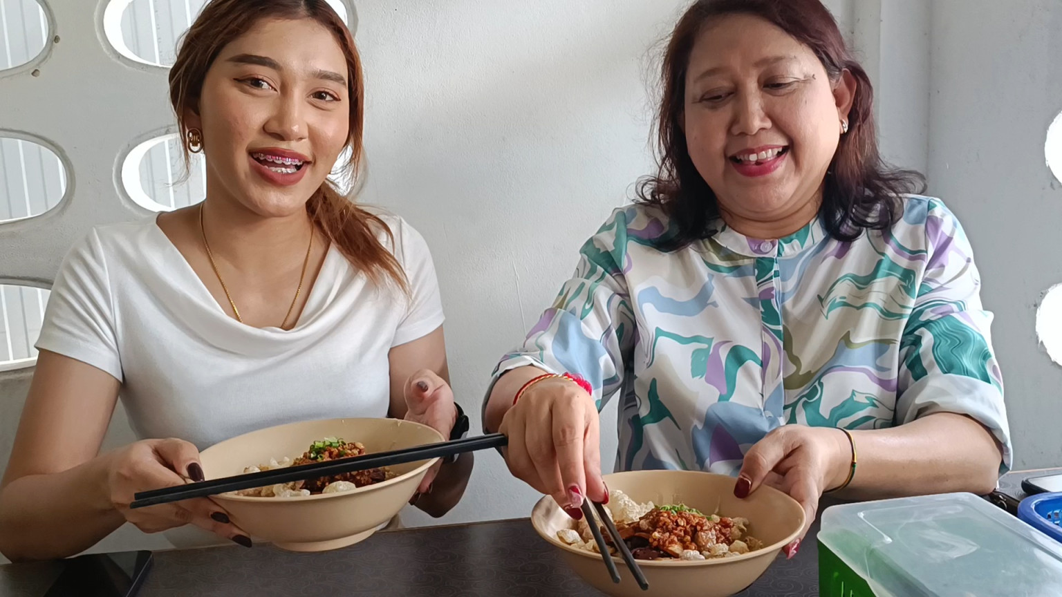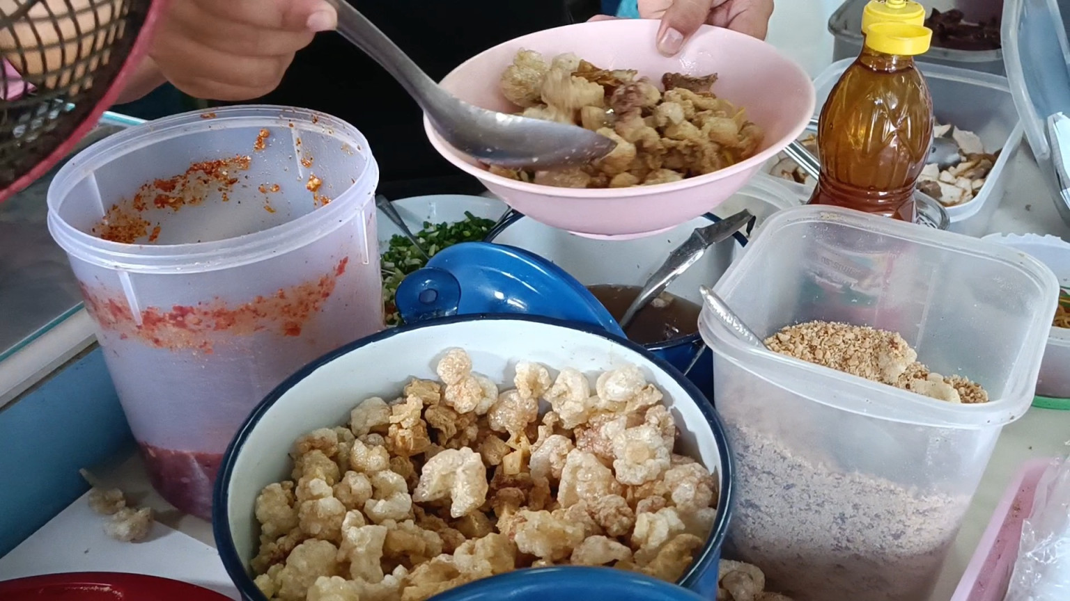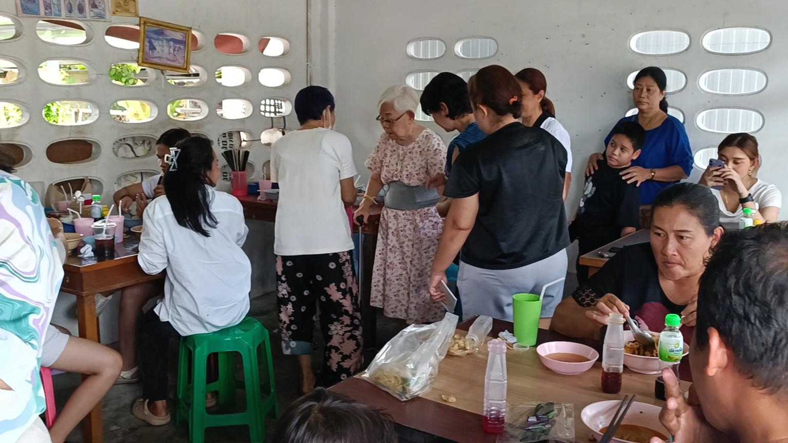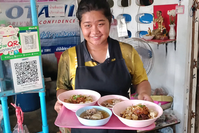 ซึ่งร้านจะอยู่ทางซ้ายมือมีป้ายร้านวางอยู่หน้าร้านเล็กๆ เมื่อเข้าไปถึงพบว่าภายในร้านมีลูกค้านั่งกินกันอยู่เต็มร้าน ซึ่งด้านในมีโต๊ะนั่งเพียง 5 โต๊ะ ด้านหน้าร้านอีก1โต๊ะ มีทั้งคนมายืนรอโต๊ะ และไรเดอร์รอรับของที่สั่งออนไลน์ ขณะที่คนลวกเส้นสาวสวยลูกสาวของป้าพรเจ้าของร้านกำลังลวกเส้นพร้อมผักบุ้งและถั่วงอกตามเมนูอย่างจ้าละหวั่น เสร็จแล้วส่งต่อให้กับคนปรุงรส ที่ใส่เครื่องเคียงแน่นๆทั้งหมูแดง เลือดหมูเส้น น้ำซอสต่างๆตบท้ายด้วยกากหมูที่ใส่กันแบบแน่นๆอย่างไม่ยั้ง ก่อนจะนำไปเสิร์ฟให้ลูกค้า