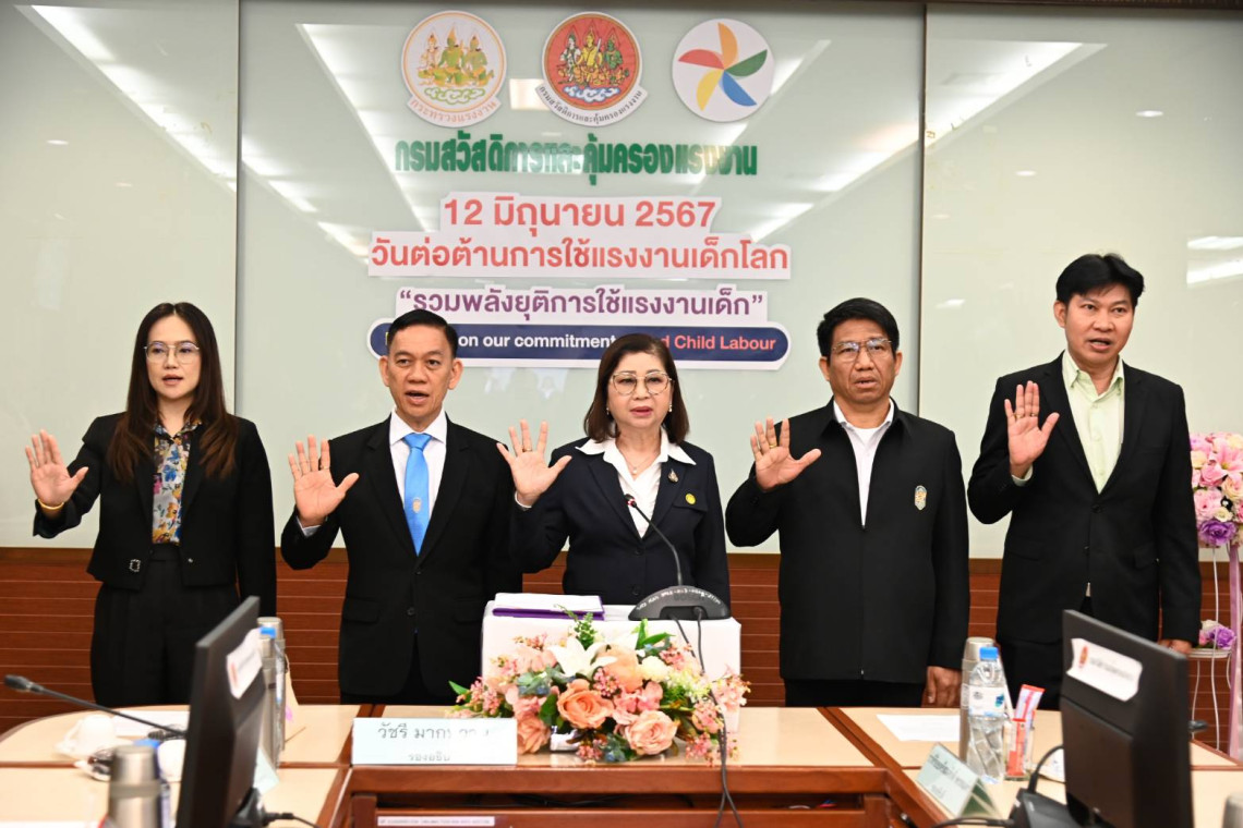 กระทรวงแรงงาน โดยกรมสวัสดิการและคุ้มครองแรงงาน รวมพลังเครือข่ายนายจ้าง ลูกจ้าง และภาคส่วนที่เกี่ยวข้องกว่า 450 คน แถลงคำมั่น พร้อมร่วมชูฝ่ามือขวาแสดงสัญลักษณ์ยุติการใช้แรงงานเด็ก เนื่องในวันต่อต้านการใช้แรงงานเด็กโลก 12 มิถุนายน ปี พ.ศ.2567 เพื่อแสดงเจตนารมณ์ ความมุ่งมั่นของประเทศไทยในการแก้ไขปัญหาแรงงานเด็ก สอดคล้องอนุสัญญา ILO
