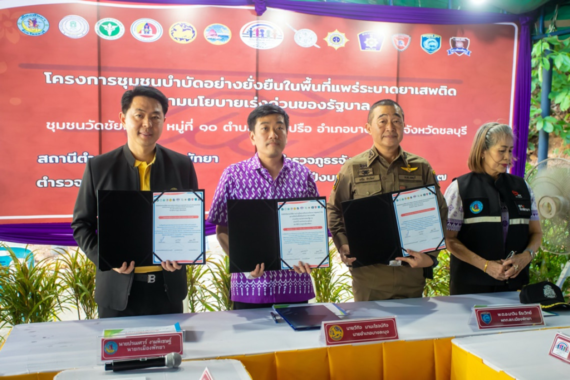 วันที่ 12 มิ.ย.67 ที่อาคารสวนสาธารณะเมืองพัทยา จ.ชลบุรี นายวีกิจ มานะโรจน์กิจ นายอำเภอบางละมุง เป็นประธานในพิธีลงนาม MOU โครงการชุมชนบำบัดอย่างยั่งยืนในพื้นที่แพร่ระบาดยาเสพติด ตาม นโยบายเร่งด่วนของรัฐบาล พร้อมด้วยภาคีเครือข่าย อาทิ นายปรเมศวร์ งามพิเชษฐ์ นายกเมืองพัทยา พ.ต.อ.พาติกรณ์ ศรชัย รอง ผบก.ภจว.ชลบุรี , พ.ต.อ.นาวิน ธีระวิทย์ ผกก.สภ.เมืองพัทยา ,พ.ต.ท.ศิรชัช หนูเทศ รอง ผกก.ป.สภ.เมืองพัทยา และหน่วยงานที่เกี่ยวข้อง