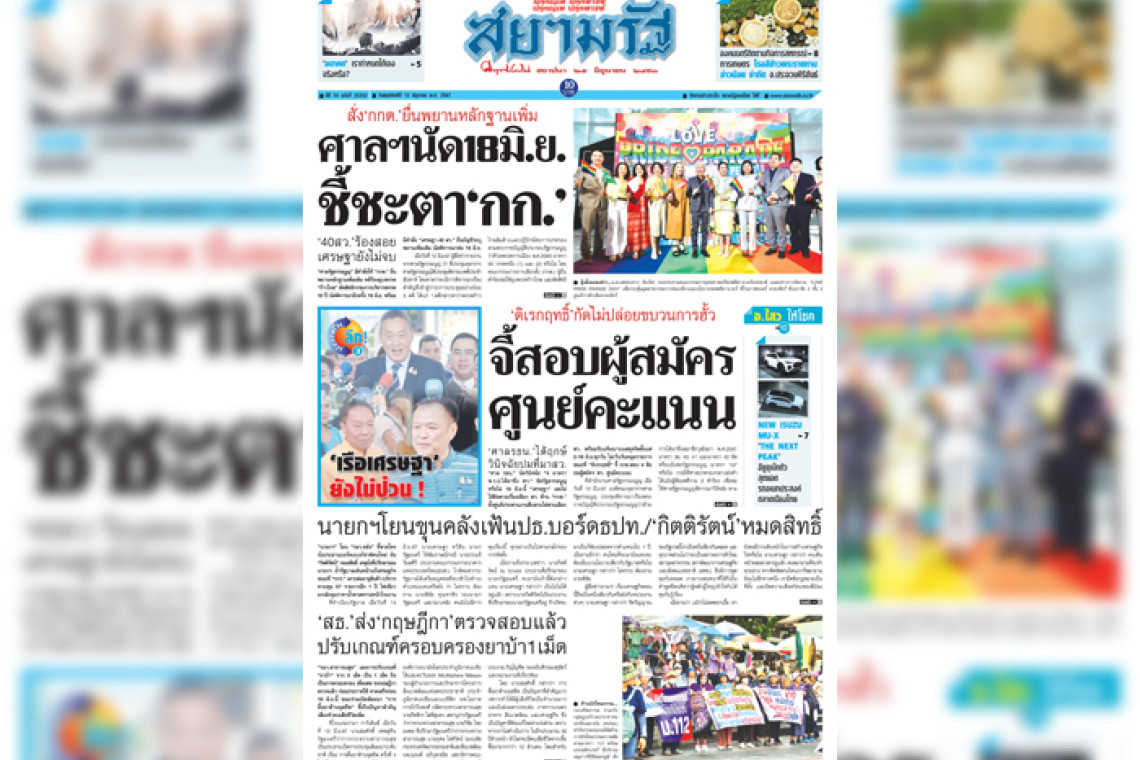 หน้า 1 หนังสือพิมพ์สยามรัฐรายวัน ฉบับวันพฤหัสบดีที่ 13 มิถุนายน 2567