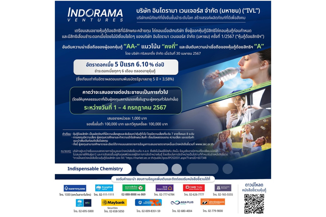 บริษัท อินโดรามา เวนเจอร์ส จำกัด (มหาชน) หรือ IVL บริษัทเคมีภัณฑ์ชั้นนำระดับโลกที่ดำเนินธุรกิจอย่างยั่งยืน เตรียมเสนอขายหุ้นกู้ด้อยสิทธิที่มีลักษณะคล้ายทุนฯ ที่ได้รับการจัดอันดับความน่าเชื่อถือระดับ "A" ต่อประชาชนในระหว่างวันที่ 1-4 กรกฎาคม 2567 ประกาศอัตราดอกเบี้ยสำหรับช่วง 5 ปีแรกไว้ที่ 6.10% ต่อปี และจ่ายดอกเบี้ยทุก 6 เดือน โดยมีวัตถุประสงค์เพื่อไถ่ถอนหุ้นกู้ด้อยสิทธิที่มีลักษณะคล้ายทุนฯ ชุดเดิมของ อินโดรามา เวนเจอร์ส ที่จะมีอายุครบ 5 ปีในเดือนพฤศจิกายน 2567