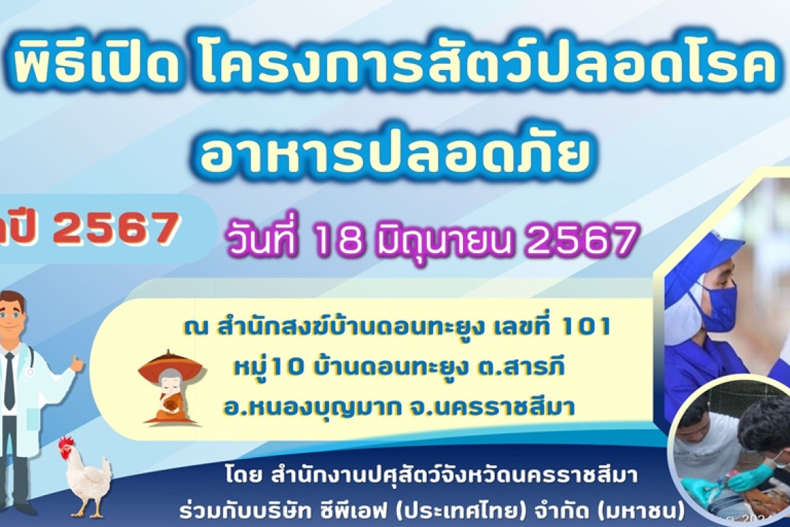 สำนักงานปศุสัตว์จังหวัดนครราชสีมา ร่วมกับ บริษัท เจริญโภคภัณฑ์อาหาร จำกัด (มหาชน) หรือซีพีเอฟ โดยโรงงานแปรรูปเนื้อ ธุรกิจไก่กระทง และธุรกิจไก่พ่อ-แม่พันธุ์ สายธุรกิจไก่เนื้อ1 และหน่วยงานที่เกี่ยวข้อง ร่วมพิธีเปิด "โครงการสัตว์ปลอดโรค อาหารปลอดภัย" ในวันอังคารที่ 18 มิถุนายน 2567 เวลา 10.00 - 12.00 น. เพื่อส่งมอบความรู้ด้านการป้องกันโรคในสัตว์เลี้ยงของประชาชน พร้อมทำวัคซีนในสัตว์เลี้ยง เพื่อป้องกันโรคที่เกิดจากสัตว์ และหยุดการแพร่ระบาด อันเป็นสาธารณประโยชน์ต่อสังคม เป็นการทำความดีเพื่อตอบแทนคุณแผ่นดิน ณ สำนักสงฆ์บ้านดอนทะยูง ต.สารภี อ.บุญมาก จ.นครราชสีมา