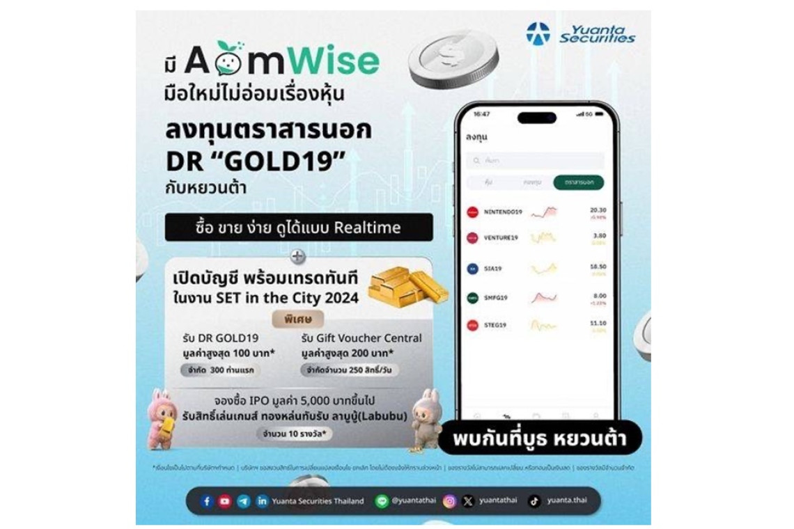 บริษัทหลักทรัพย์ หยวนต้า (ประเทศไทย) จำกัด นำร่องเป็นผู้ให้บริการแอปพลิเคชัน “AomWise” (ออมไวซ์) แพลตฟอร์มที่จะทำให้การออมและลงทุนเป็นเรื่องง่าย สะดวก และปลอดภัย เป็นทางเลือกให้ทุกคนสามารถบรรลุเป้าหมายทางการเงินได้ ภายใต้แนวคิด “แอปออมสุดชิลล์ ลงทุนแบบชิลล์สุด” พัฒนาโดย Settrade พร้อมลงทุนได้ทันที และเตรียมพบกับ DR “GOLD19” ของหยวนต้า ที่งาน SET in the City 2024 สำหรับลูกค้าเปิดบัญชีใหม่ ผ่านแอปพลิเคชัน AomWise ภายในงาน SET in the City 2024 ในระหว่างวันที่ 15-16 มิถุนายน 2567 จะได้พบกับกิจกรรม ลุ้นรับรางวัลมากมาย พร้อมรับโปรโมชั่นพิเศษ 2 ต่อ